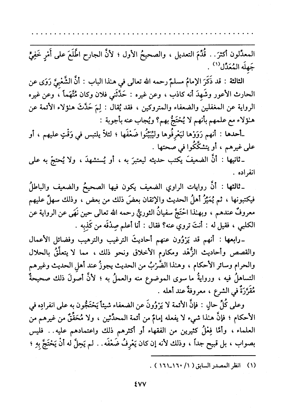 الثالثة: قد ذَكَرَ الإمامُ مسلمٌ رحمه الله تعالى في هذا الباب: أن الشَّعْبيُّ رَوَى عن الحارث الأعور وشَهِدَ أنَّه كاذب، وعن غيره: حَدَّثَني فلان وكان مُتَّهَمًا، وعن غيره الرواية عن المغفلين والضعفاء والمتروكين، فقد يُقال: لِمَ حَدَّثَ هؤلاء الأئمة عن هؤلاء مع علمهم بأنهم لا يُحْتَجُّ بهم؟ ويُجاب عنه بأجوبة: