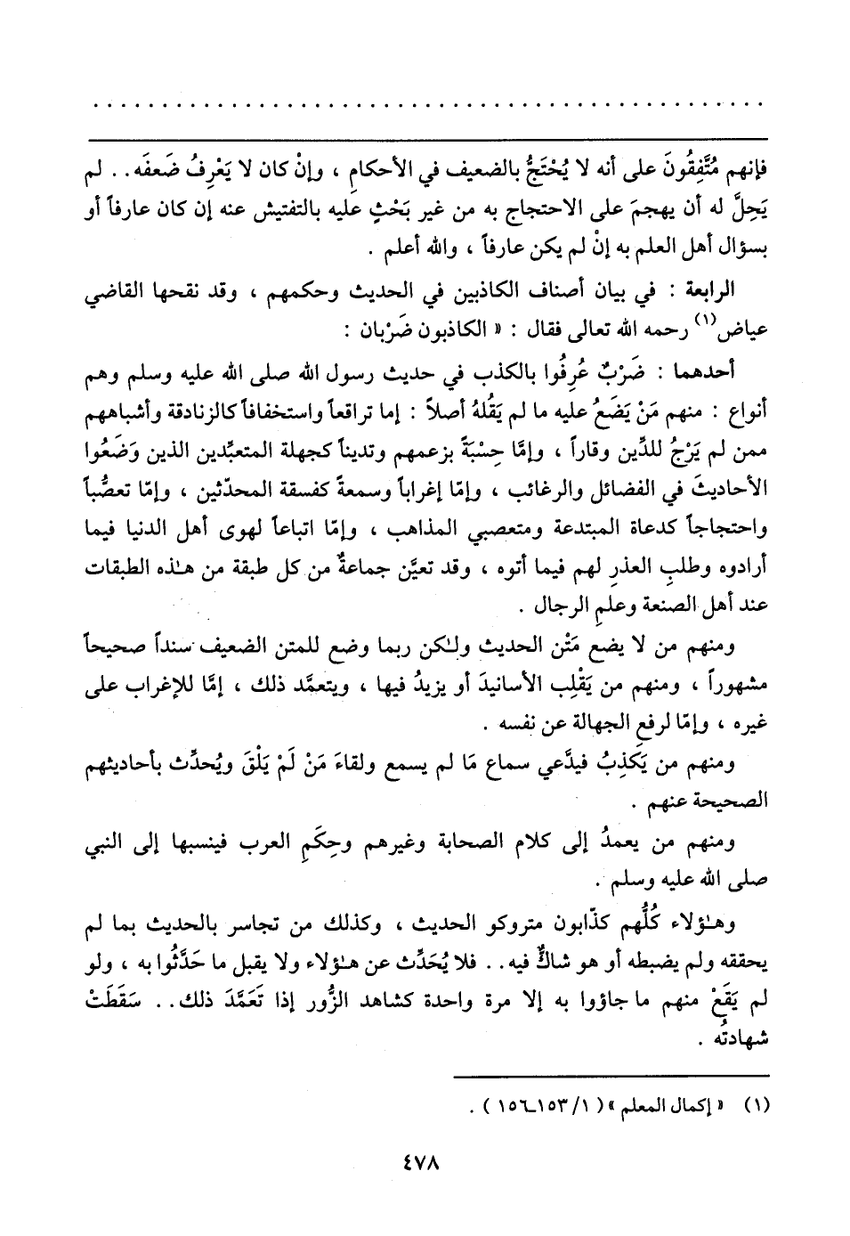الرابعة: في بيان أصناف الكاذبين في الحديث وحكمهم، وقد نقحها القاضي عياض (١) رحمه الله تعالى فقال: "الكاذبون ضَرْبان: