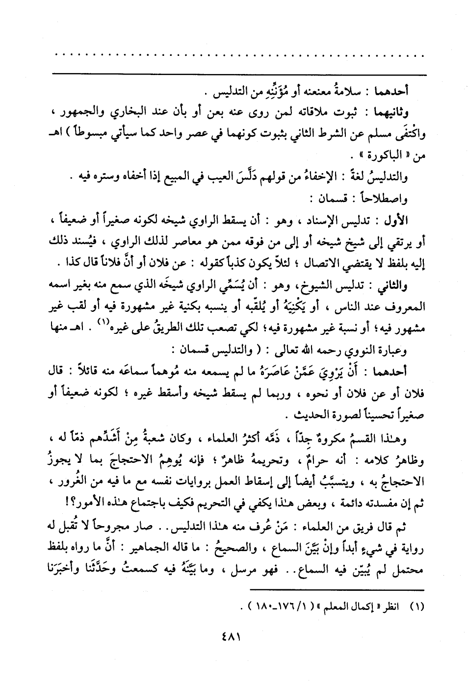 وثانيهما: ثبوت ملاقاته لمن روى عنه بعن أو بأن عند البخاري والجمهور، واكْتفَى مسلم عن الشرط الثاني بثبوت كونهما في عصر واحد كما سيأتي مبسوطًا) اهـ من "الباكورة".