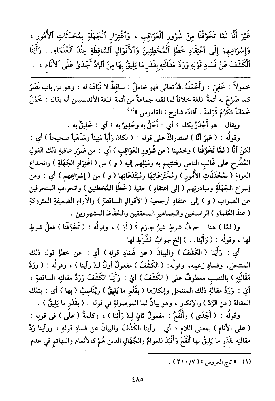 غَيرَ أَنَّا لَمَّا تَخَوَّفْنَا مِنْ شُرُورِ الْعَوَاقِبِ، وَاغْتِرَارِ الْجَهَلَةِ بِمُحْدَثَاتِ الأُمُورِ، وإِسْرَاعِهِمْ إِلَى اعْتِقَادِ خَطَإ الْمُخْطِئِينَ وَالأَقْوَالِ السَّاقِطَةِ عِنْدَ الْعُلَمَاءِ .. رَأَينَا الْكَشْفَ عَنْ فَسَادِ قَوْلهِ وَرَدَّ مَقَالتِهِ بِقَدْرِ مَا يَلِيقُ بِهَا مِنَ الرَّدِّ أَجْدَى عَلَى الأَنَامِ،