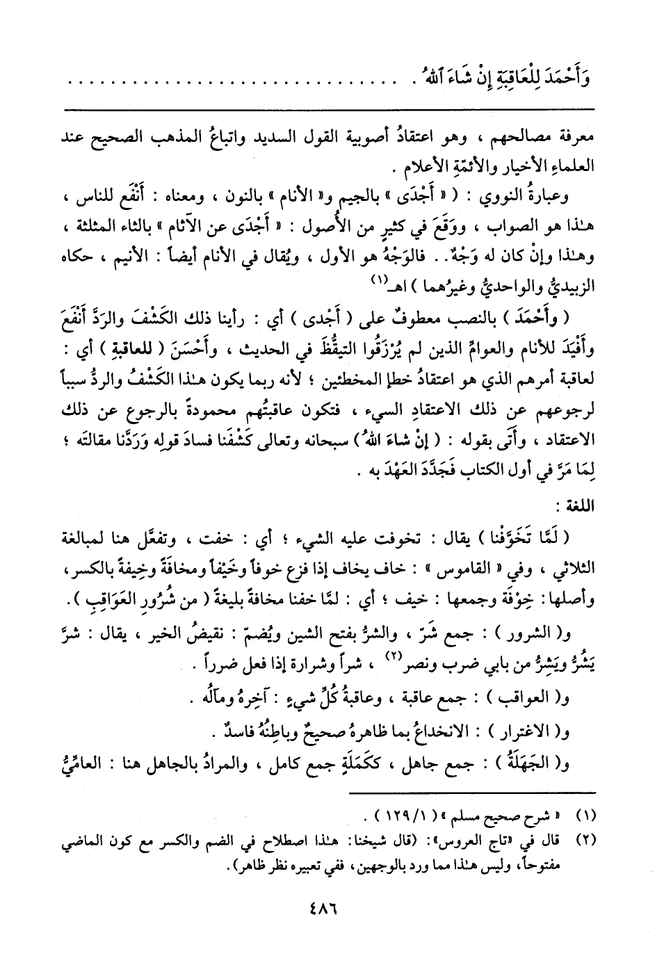 (وأَحْمَدَ) بالنصب معطوفٌ على (أَجْدى) أي: رأينا ذلك الكَشْفَ والرَدَّ أَنْفَعَ وأَفْيَدَ للأنام والعوامِّ الذين لم يُرْزَقُوا التيقُّظَ في الحديث، وأَحْسَنَ (للعاقبةِ) أي: لعاقبة أمرهم الَّذي هو اعتقادُ خطإ المخطئين؛ لأنه ربما يكون هذا الكَشْفُ والردُّ سببًا لرجوعهم عن ذلك الاعتقادِ السيء، فتكون عاقبتُهم محمودةً بالرجوع عن ذلك الاعتقاد، وأَتَى بقوله: (إنْ شاءَ اللهُ) سبحانه وتعالى كَشْفَنا فسادَ قوله وَرَدَّنا مقالتَه؛ لِمَا مَرَّ في أول الكتاب فَجَدَّدَ العَهْدَ به.