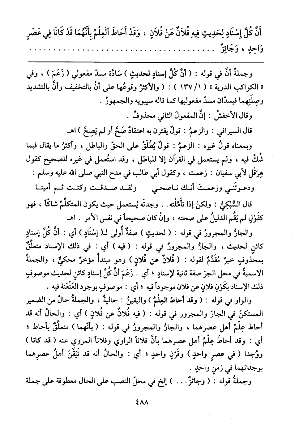 وجملةُ أن في قوله: (أن كُلَّ إسنادٍ لحديثٍ) سَادة مسدّ مفعولي (زَعَمَ)، وفي "الكواكب الدرية" (١/ ١٣٧): (والأكثرُ وقوعُها على أنْ بالتخفيف وأنَّ بالتشديد وصِلَتِهما فيسدّان مسدّ مفعوليها كما قاله سيبويه والجمهورُ.