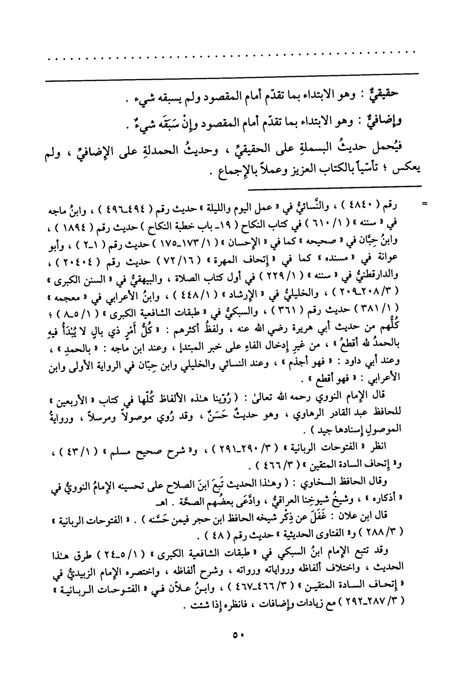 = رقم (٤٨٤٠)، والنَّسائيُّ " عمل اليوم والليلة" حديث رقم (٤٩٤ - ٤٩٦)، وابنُ ماجه في "سننه" (١/ ٦١٠) في كتاب النكاح (١٩ - باب خطبة النكاح) حديث رقم (١٨٩٤)، وابنُ حِبَّان في "صحيحه" كما في "الإحسان" (١/ ١٧٣ - ١٧٥) حديث رقم (١ - ٢)، وأبو عوانة في "مسنده" كما في "إِتحاف المهرة" (١٦/ ٧٢) حديث رقم (٢٠٤٠٤)، والدارقطنيُّ في "سننه" (١/ ٢٢٩) في أول كتاب الصلاة، والبيهقيُّ في "السنن الكبرى" (٣/ ٢٠٨ - ٢٠٩)، والخليليُّ في "الإِرشاد" (١/ ٤٤٨)، وابنُ الأعرابي في "معجمه" (١/ ٣٨١) حديث رقم (٣٦١)، والسبكيُّ في "طبقات الشافعية الكبرى" (١/ ٥ - ٨)؛ كُلُّهم من حديث أبي هريرة رضي الله عنه، ولفظُ أكثرهم: "كُلُّ أَمْرٍ ذي بالِ لا يُبْدَأُ فيهِ بالحمدُ لله أقطعُ"، من غيرِ إِدخال الفاءِ على خبر المبتدإ، وعند ابن ماجه: "بالحمدِ"، وعند أبي داود: "فهو أجذم"، وعند النسائي والخليلي وابن حبَّان في الرواية الأولى وابن الأعرابي: "فهو أقطع".