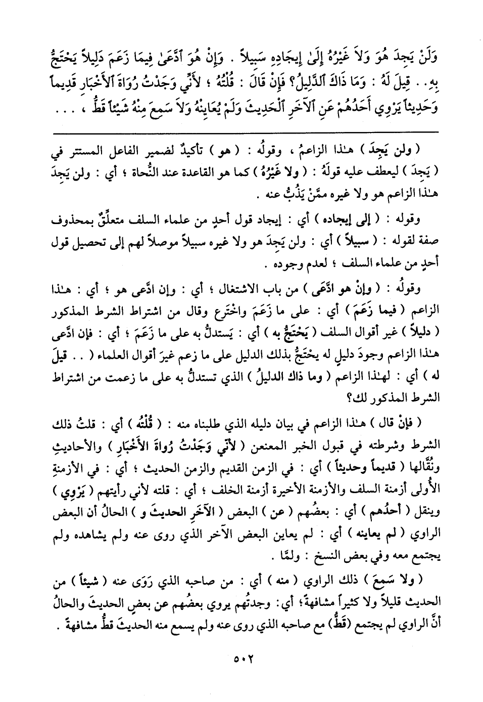 وَلَنْ يَجِدَ هُوَ وَلَا غَيرُهُ إِلَى إِيجَادِهِ سَبيلًا. وَإِنْ هُوَ ادَّعَى فِيمَا زَعَمَ دَلِيلًا يَحْتَجُّ بِهِ .. قِيلَ لَهُ: وَمَا ذَاكَ الدَّلِيلُ؟ فَإنْ قَالً: قُلْتُهُ؛ لأَنِّي وَجَدْتُ رُوَاةَ الأَخْبَارِ قَدِيمًا وَحَدِيثًا يَرْوي أَحَدُهُمْ عَنِ الآخَرِ الْحَدِيثَ وَلَمْ يُعَايِنْهُ وَلَا سَمعَ مِنْهُ شَيئا قَطُّ،
