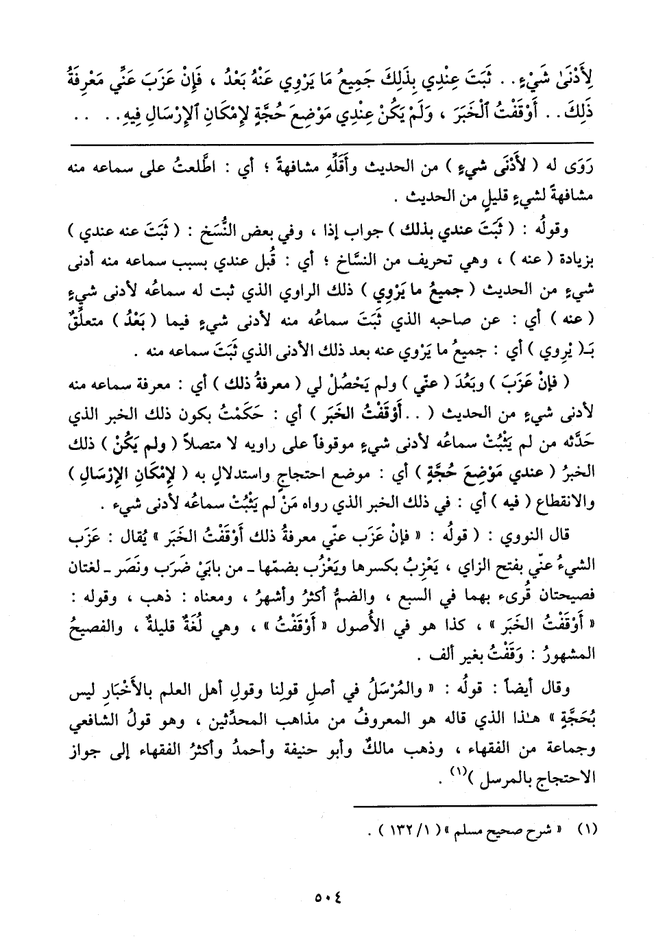 وقال أيضًا: قولُه: "والمُرْسَلُ في أصلِ قولنا وقولِ أهل العلم بالأَخْبَارِ ليس بُحَجَّةٍ" هذا الذي قاله هو المعروفُ من مذاهب المحدِّثين، وهو قولُ الشافعي وجماعة من الفقهاء، وذهب مالكٌ وأبو حنيفة وأحمدُ وأكثرُ الفقهاء إلى جواز الاحتجاج بالمرسل) (١).