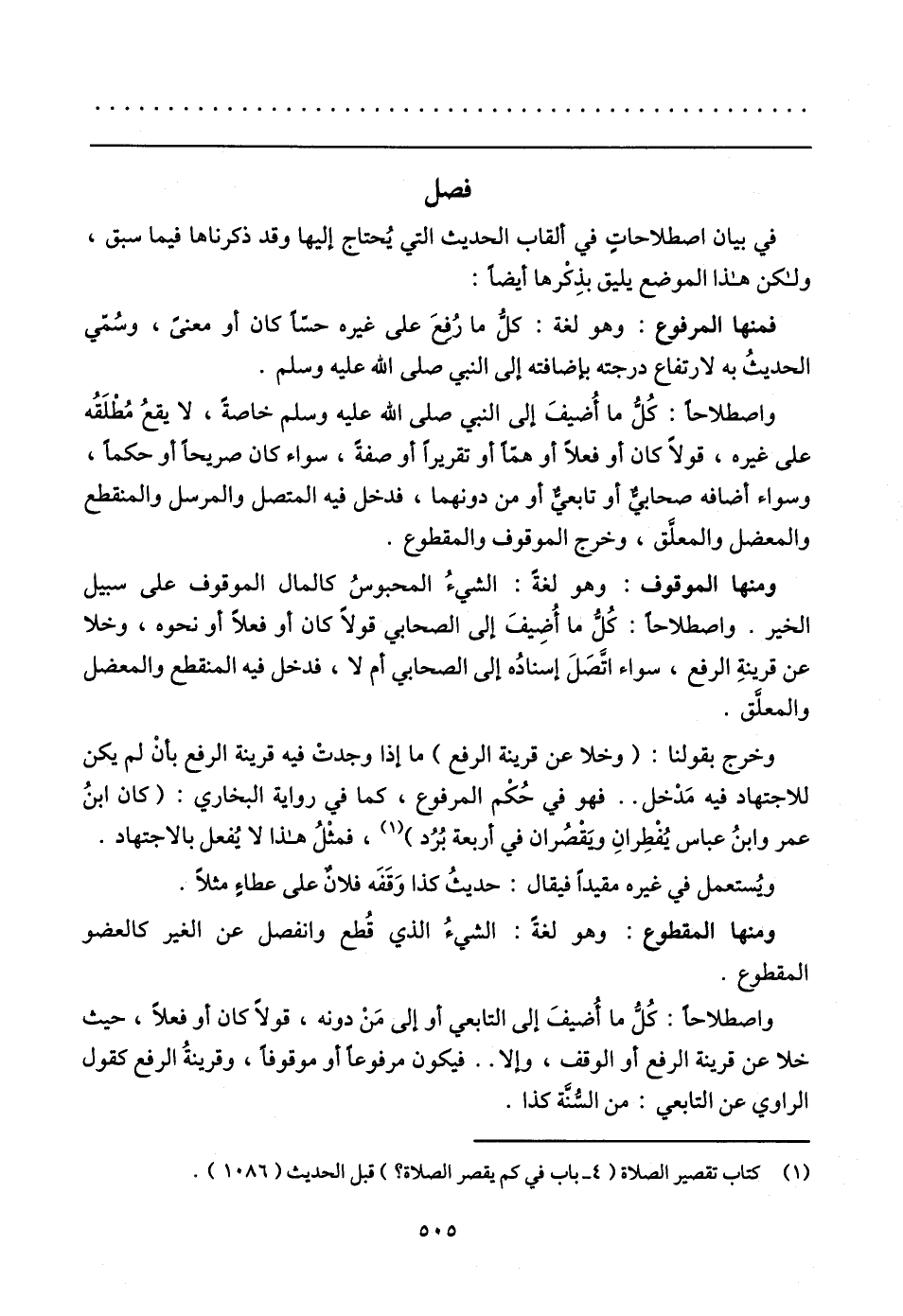 ومنها الموقوف: وهو لغةً: الشيءُ المحبوسُ كالمال الموقوف على سبيل الخير، واصطلاحًا: كُل ما أُضِيفَ إلى الصحابي قولًا كان أو فعلًا أو نحوه، وخلا عن قرينةِ الرفع، سواء اتَّصَلَ إسنادُه إلى الصحابي أم لا، فدخل فيه المنقطع والمعضل والمعلَّق.