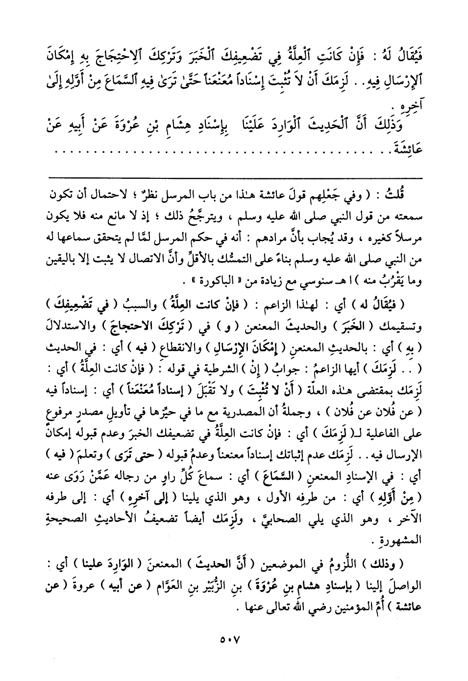 قُلتُ: (وفي جَعْلِهم قولَ عائشة هذا من باب المرسل نظرٌ؛ لاحتمال أن تكون سمعته من قول النبي صلى الله عليه وسلم، ويترجَّحُ ذلك؛ إذ لا مانع منه فلا يكون مرسلًا كغيره، وقد يُجاب بأنَّ مرادهم: أنه في حكم المرسل لمَّا لم يتحقق سماعها له من النبي صلى الله عليه وسلم بناءً على التمسُّك بالأقلِّ وأنَّ الاتصال لا يثبت إلا باليقين وما يَقْرُبُ منه) اهـ سنوسي مع زيادة من "الباكورة".