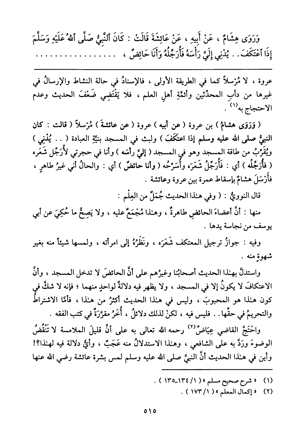 وَرَوَى هِشَامٌ، عَنْ أَبِيهِ، عَنْ عَائِشَةَ قَالتْ: كَانَ النَّبِي صَلَّى اللهُ عَلَيهِ وَسَلَّمَ إِذَا اعْتَكَفَ .. يُدْنِي إِلَيَّ رَأْسَهُ فَأُرَجِّلُهُ وَأنَا حَائِضٌ،