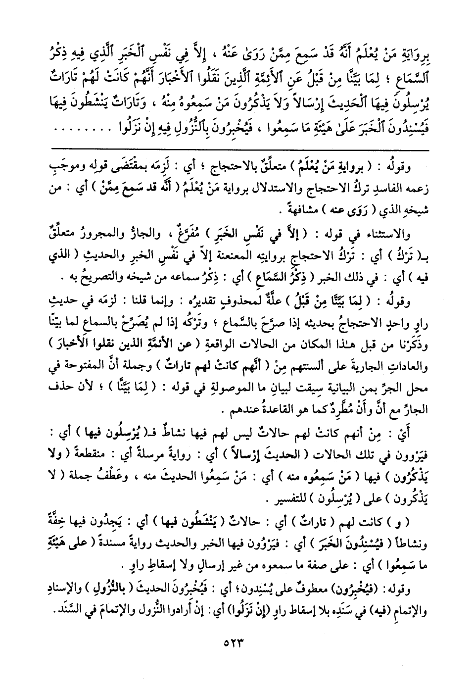 بِرِوَايَةِ مَنْ يُعْلَمُ أَنَّهُ قَدْ سَمعَ مِمَّنْ رَوَى عَنْهُ، إِلَّا فِي نَفْسِ الْخَبَرِ الَّذِي فِيهِ ذِكْرُ السَّمَاعِ؛ لِمَا بَيَّنَّا مِنْ قَبْلُ عَنِ الأَئِمَّةِ الَّذِينَ نَقَلُوا الأَخْبَارَ أَنَّهُمْ كَانَتْ لَهُمْ تَارَاتٌ يُرْسِلُونَ فِيهَا الْحَدِيثَ إِرْسَالًا وَلَا يَذْكُرُونَ مَنْ سَمِعُوهُ مِنْهُ، وَتَارَاتٌ يَنْشَطُونَ فِيهَا فَيُسْنِدُونَ الْخَبَرَ عَلَى هَيئَةِ مَا سَمِعُوا، فَيُخْبِرُونَ بِالنُّزُولِ فِيهِ إِنْ نَزَلُوا