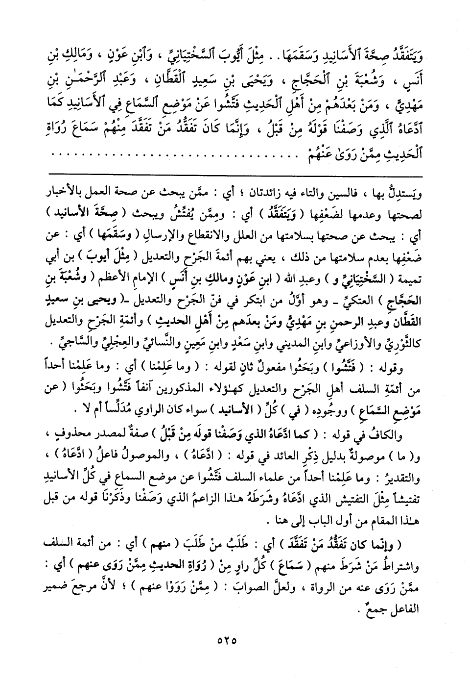 وَيَتَفَقَّدُ صِحَّةَ الأَسَانِيدِ وَسَقَمَهَا .. مِثْلَ أَيُّوبَ السَّخْتِيَانِيِّ، وَابْنِ عَوْنٍ، وَمَالِكِ بْنِ أَنَسٍ، وَشُعْبَةَ بْنِ الْحَجَّاجِ، وَيَحْيى بْنِ سَعِيدٍ الْقَطَّانِ، وَعَبْدِ الرَّحْمَنِ بْنِ مَهْدِيِّ، وَمَنْ بَعْدَهُمْ مِنْ أَهْلِ الْحَدِيثِ فتَّشُوا عَنْ مَوْضِعِ السَّمَاعِ فِي الأَسَانِيدِ كَمَا ادَّعَاهُ الَّذِي وَصَفْنَا قَوْلَهُ مِنْ قَبْلُ، وإنَّمَا كَانَ تَفَقُّدُ مَنْ تَفَقَّدَ مِنْهُمْ سَمَاعَ رُوَاةِ الْحَدِيثِ مِمَّنْ رَوَى عَنْهُمْ