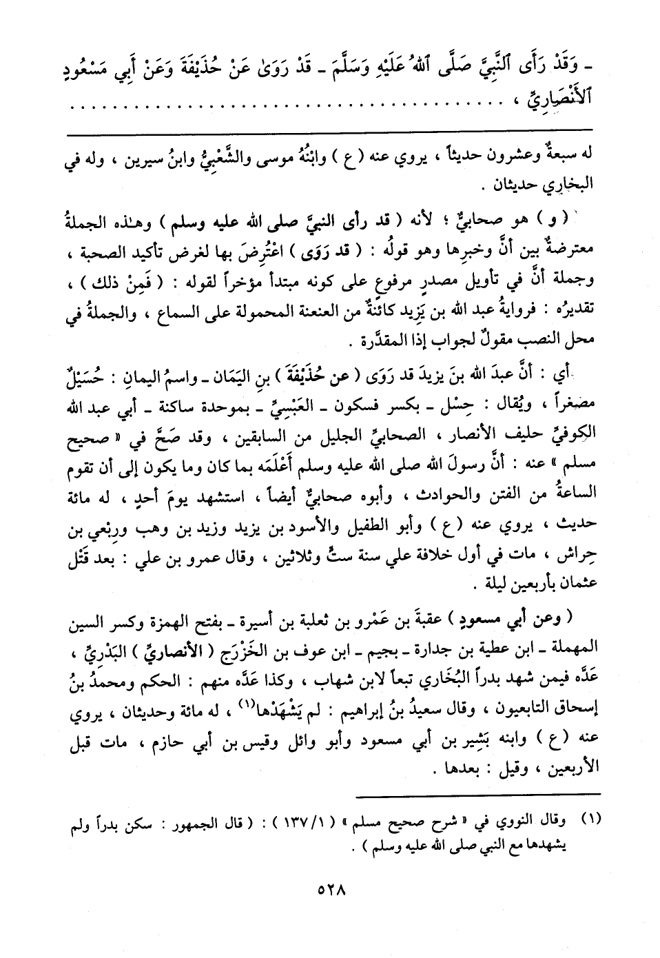 (١) وقال النووي في "شرح صحيح مسلم" (١/ ١٣٧): (قال الجمهور: سكن بدرًا ولم يشهدها مع النبي صلى الله عليه وسلم).