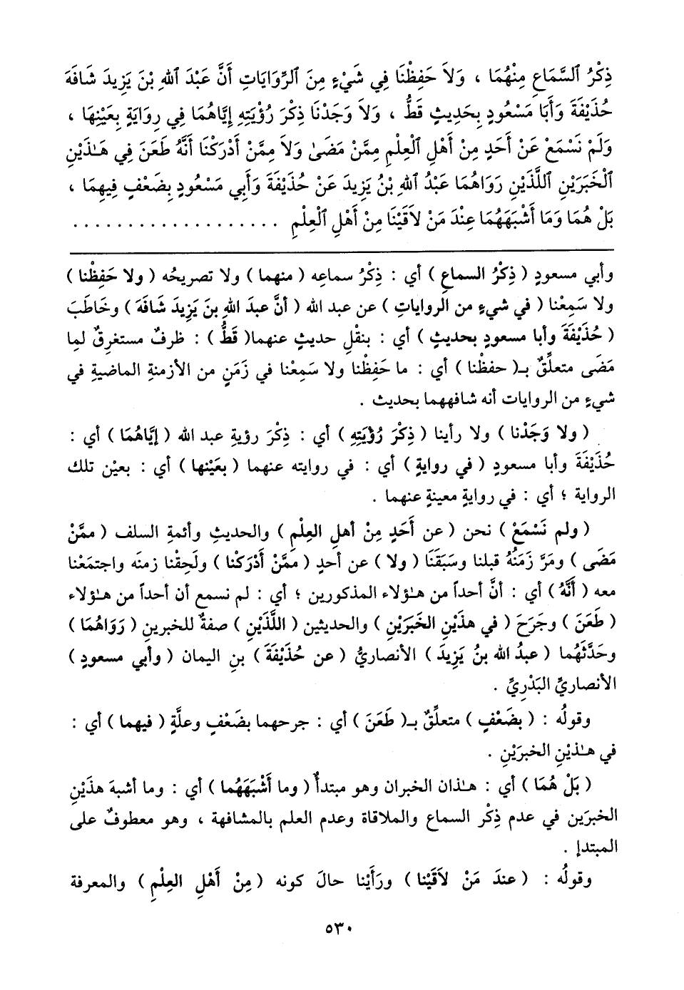 (ولم نَسْمَعْ) نحن (عن أَحَدٍ مِنْ أهلِ العِلْمِ) والحديثِ وأئمةِ السلف (ممَّنْ مَضَى) ومَرَّ زَمَنُهُ قبلنا وسَبَقَنَا (ولا) عن أحدٍ (ممَّنْ أَدْرَكْنا) ولَحِقْنا زمنَه واجتمَعْنا معه (أنَّهُ) أي: أن أحدًا من هؤلاء المذكورين؛ أي: لم نسمع أن أحدًا من هؤلاء (طَعَنَ) وجَرَحَ (في هذَينِ الخَبرَينِ) والحديثين (اللَّذَينِ) صفة للخبرينِ (رَوَاهُمَا) وحَدَّثَهُما (عبدُ الله بن يَزِيدَ) الأنصاريُّ (عن حُذَيفَةَ) بنِ اليمان (وأبي مسعودٍ) الأنصاريَّ البَدْرِيِّ.