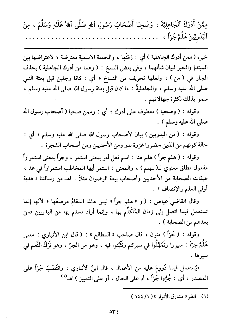 وقوله: (هلم جرًا) هلم هنا: اسم فعل أمر بمعنى استمر، وجرًا بمعنى استمرارًا مفعول مطلق معنوي لـ (هلم)، والمعنى: استمر أيها المخاطب استمرارًا في عد، طبقات الصحابة من الأحديين وأصحاب بيعة الرضوان مثلًا. اهـ من رسالتنا "هدية أولي العلم والإنصاف".