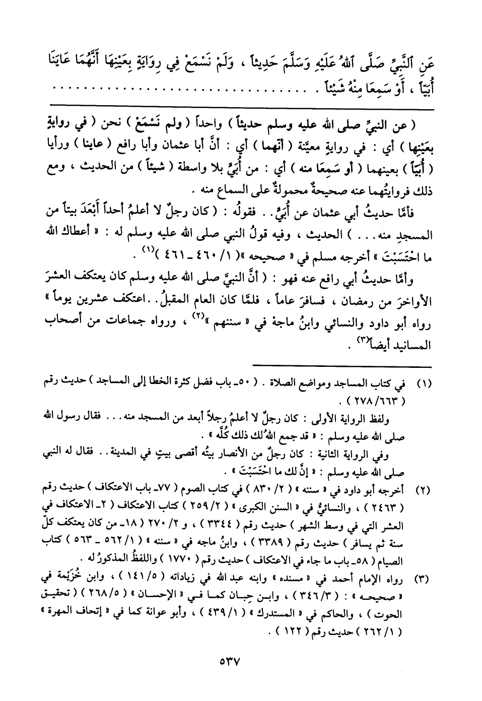 وأمَّا حديثُ أبي رافع عنه فهو: (أن النبيَّ صلى الله عليه وسلم كان يعتكف العشرَ الأواخرَ من رمضان، فسافرَ عامًا، فلمَّا كان العام المقبلُ .. اعتكف عشرين يومًا" رواه أبو داود والنسائي وابنُ ماجهْ في "سننهم" (٢)، ورواه جماعات من أصحاب المسانيد أيضًا (٣).