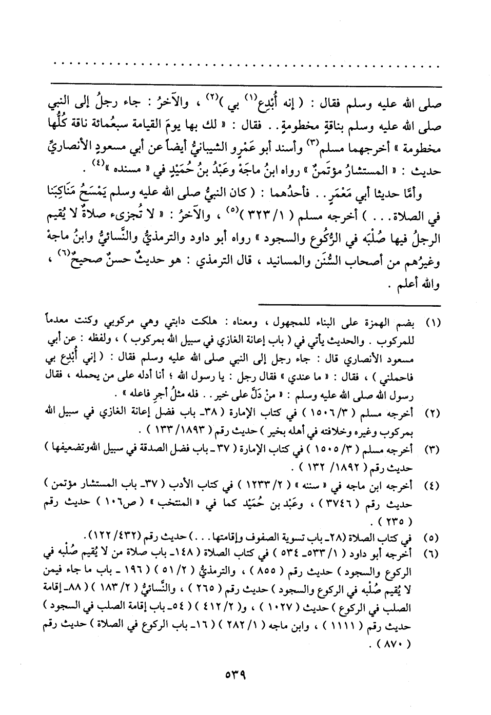 (٦) أخرجه أبو داود (١/ ٥٣٣ - ٥٣٤) في كتاب الصلاة (١٤٨ - باب صلاة من لا يُقيم صُلْبه في الركوع والسجود) حديث رقم (٨٥٥)، والترمذيُّ (٢/ ٥١) (١٩٦ - باب ما جاء فيمن لا يُقيم صُلْبه في الركوع والسجود) حديث رقم (٢٦٥)، والنَّسائيُّ (٢/ ١٨٣) (٨٨ - إقامة الصلب في الركوع) حديث (١٠٢٧)، و (٢/ ٤١٢) (٥٤ - باب إقامة الصلب في السجود) حديث رقم (١١١١)، وابن ماجه (١/ ٢٨٢) (١٦ - باب الركوع في الصلاة) حديث رقم (٨٧٠).