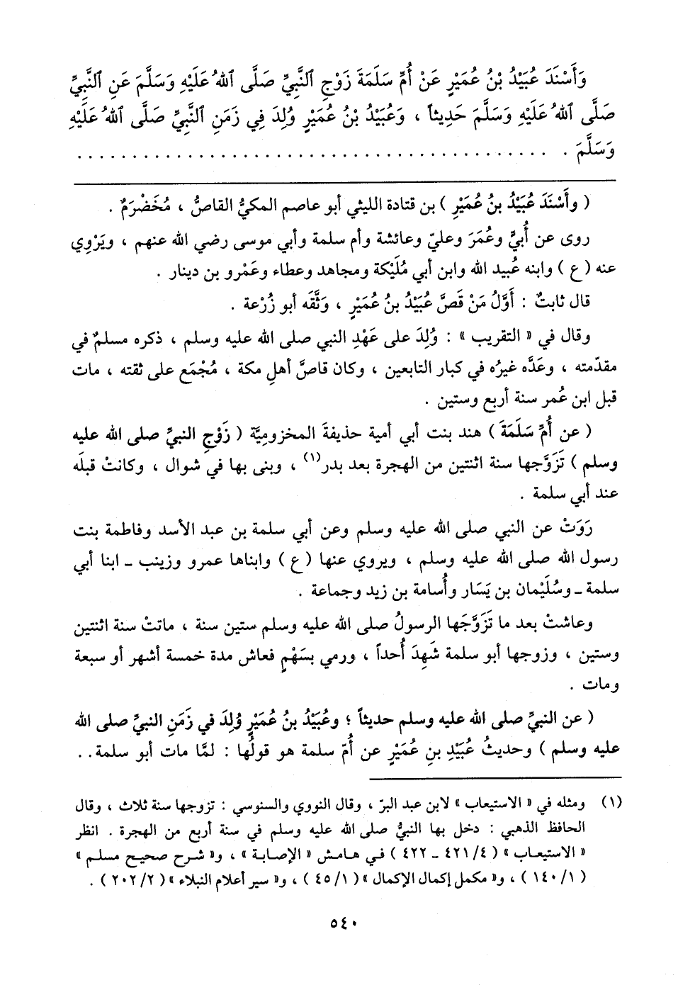 (عن النبيِّ صلى الله عليه وسلم حديثًا؛ وعُبَيدُ بن عُمَيرٍ وُلِدَ في زَمَنِ النبيِّ صلى الله عليه وسلم) وحديثُ عُبَيدِ بنِ عُمَيرٍ عن أُمّ سلمة هو قولُها: لمَّا مات أبو سلمة ..