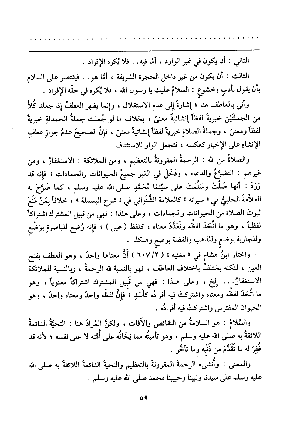 والصلاةُ من الله: الرحمةُ المقرونةُ بالتعظيم، ومن الملائكة: الاستغفارُ، ومن غيرهم؛ التضرُّعُ والدعاء، ودَخَلَ في الغير جميعُ الحيوانات والجمادات؛ فإنه قد وَرَدَ: أنها صَلَّتْ وسَلَّمَتْ على سيِّدنا مُحَمَّدٍ صلى الله عليه وسلم، كما صَرَّحَ به العلَّامةُ الحلبيُّ في "سيرته" كالعلامة الشَّنَواني في "شرح البسملة"، خلافًا لِمَنْ مَنَعَ ثبوتَ الصلاة من الحيوانات والجمادات، وعلى هذا: فهي من قبيل المشترك اشتراكًا لفظيًّا، وهو ما اتَّحَدَ لفظُه وتَعَدَّدَ معناه، كلفظ (عين)؛ فإنه وُضع للباصرةِ بوَضْعٍ وللجارية بوضعٍ وللذهب والفضة بوضعٍ وهكذا.