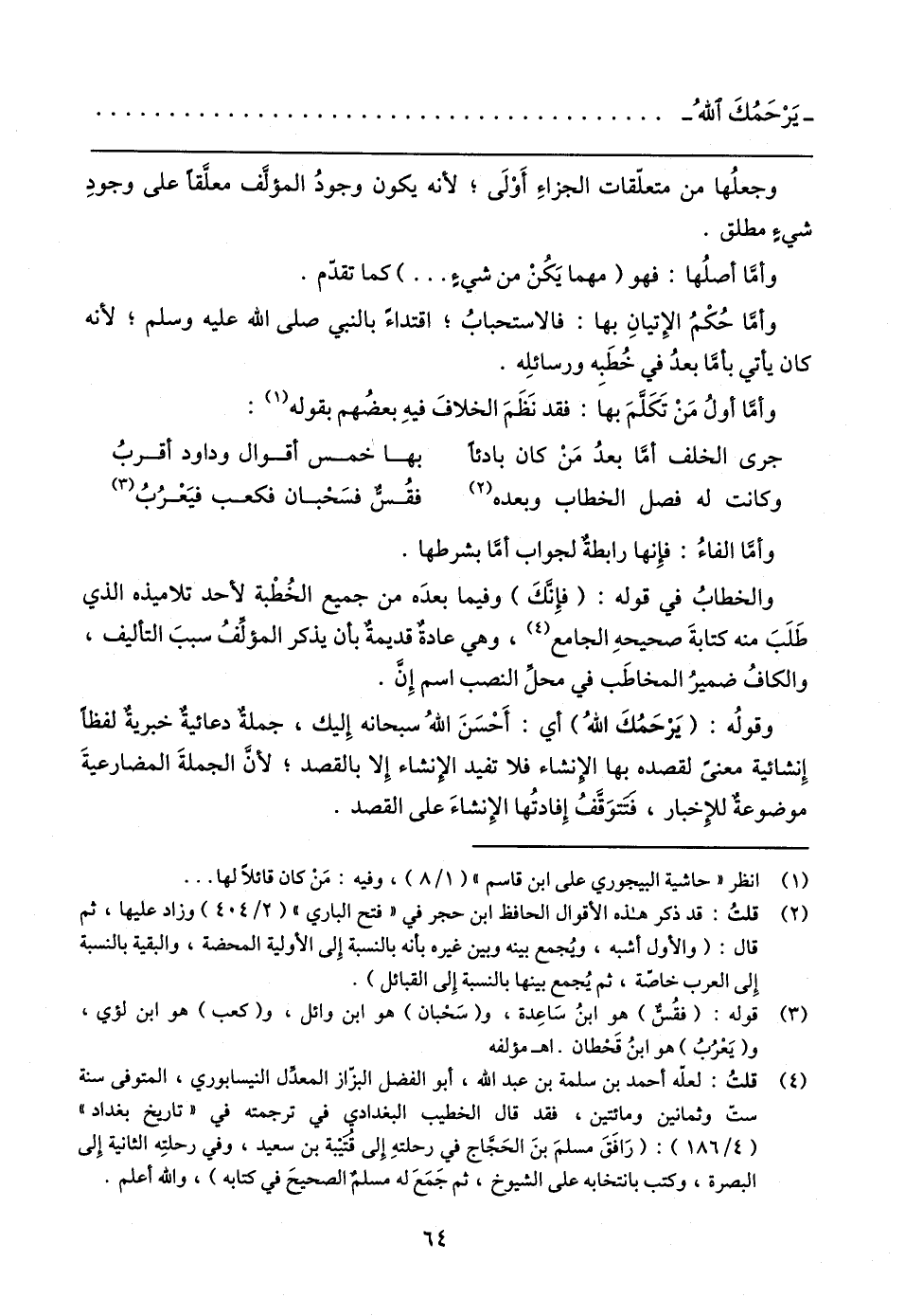 وقولُه: (يَرْحَمُكَ اللهُ) أي: أَحْسَنَ اللهُ سبحانه إِليك، جملةٌ دعائيةٌ خبريةٌ لفظًا إِنشائية معنىً لقصده بها الإنشاء فلا تفيد الإنشاء إِلا بالقصد؛ لأنَّ الجملةَ المضارعيةَ موضوعةٌ للإِخبار، فتَتوَقَّفُ إِفادتُها الإِنشاءَ على القصد.