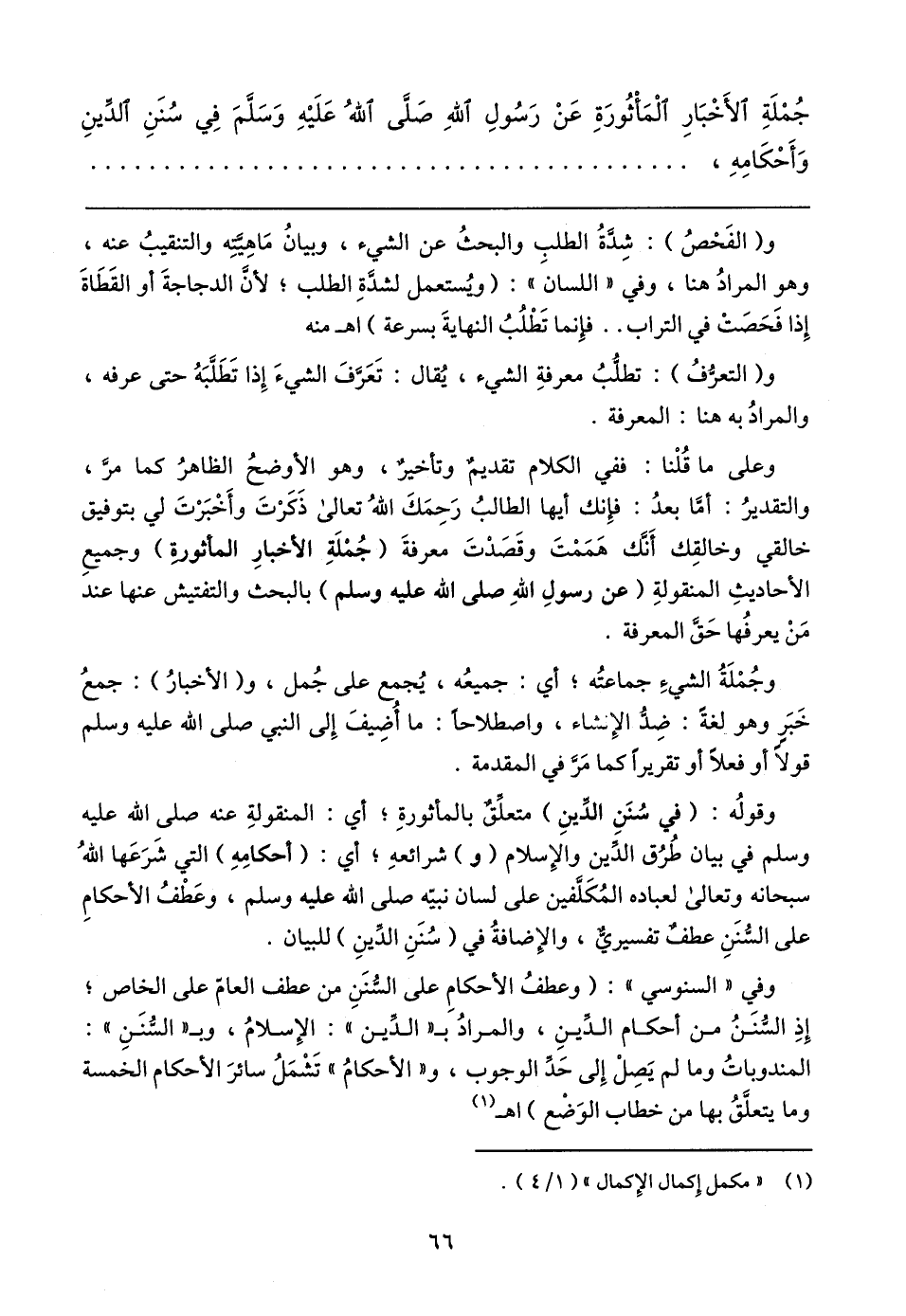 وفي "السنوسي": (وعطفُ الأحكامِ على السُّنَنِ من عطف العامّ على الخاص؛ إِذِ السُّنَنُ من أحكام الدِّينِ، والمرادُ بـ"الدِّين": الإِسلامُ، وبـ"السُّنَنِ": المندوباتُ وما لم يَصِلْ إِلى حَدِّ الوجوب، و"الأحكامُ " تَشْمَلُ سائرَ الأحكام الخمسة وما يتعلَّقُ بها من خطاب الوَضْع) اهـ (١).