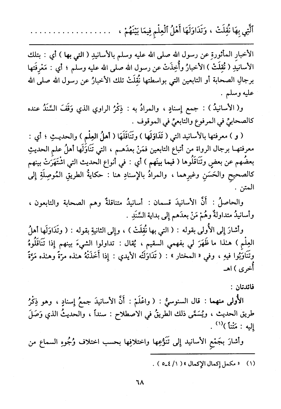 الأُولى منهما: قال السنوسيُّ: (واعْلَمْ: أَن الأسانيدَ جمعُ إِسنادٍ، وهو ذِكْرُ طريق الحديث، ويُسَمَّى ذلك الطريقُ في الاصطلاح: سندًا، والحديثُ الذي وَصَلَ إِليه: مَتْنًا) (١).