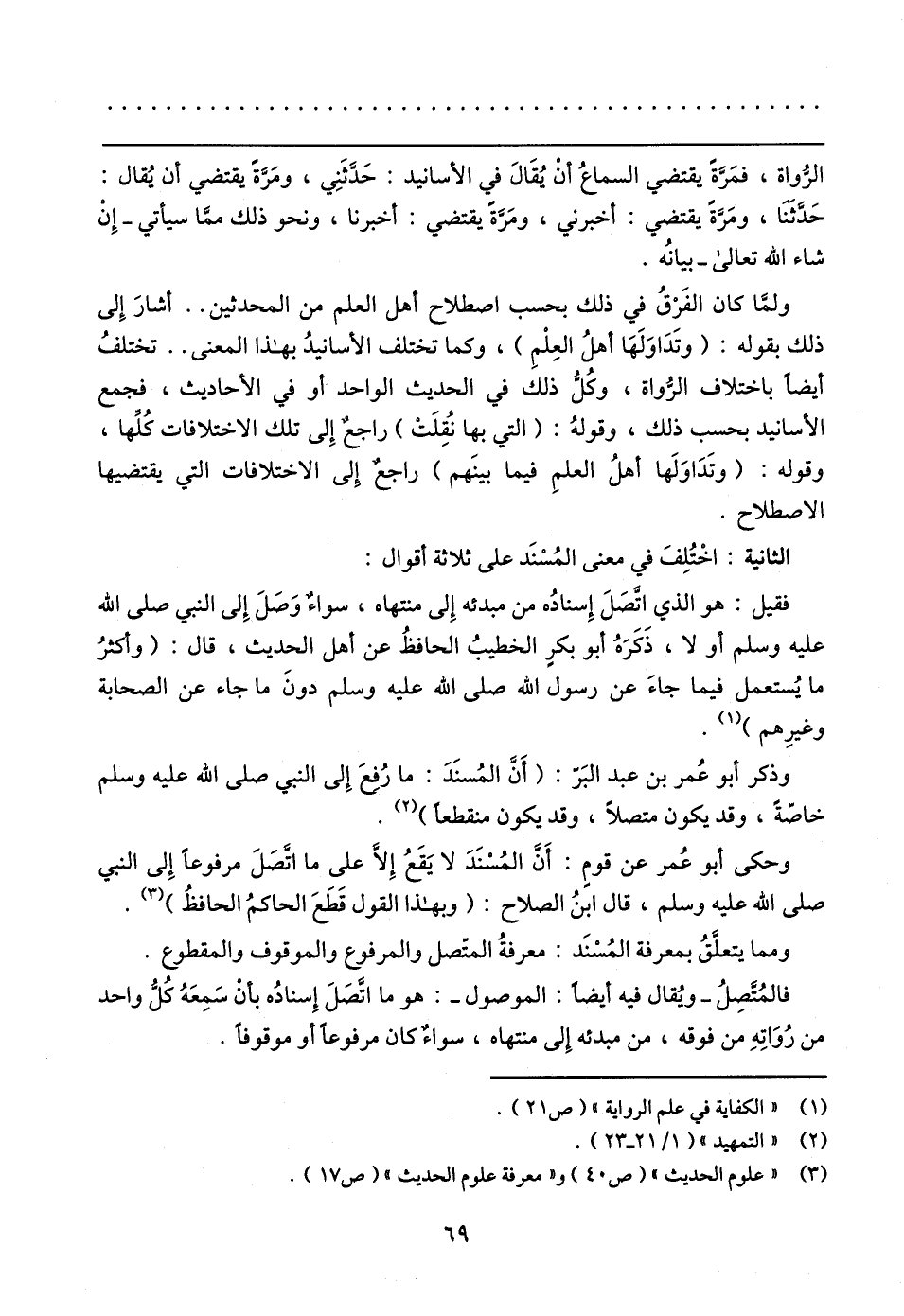 ومما يتعلَّقُ بمعرفة المُسْنَد: معرفةُ المتّصل والمرفوع والموقوف والمقطوع.