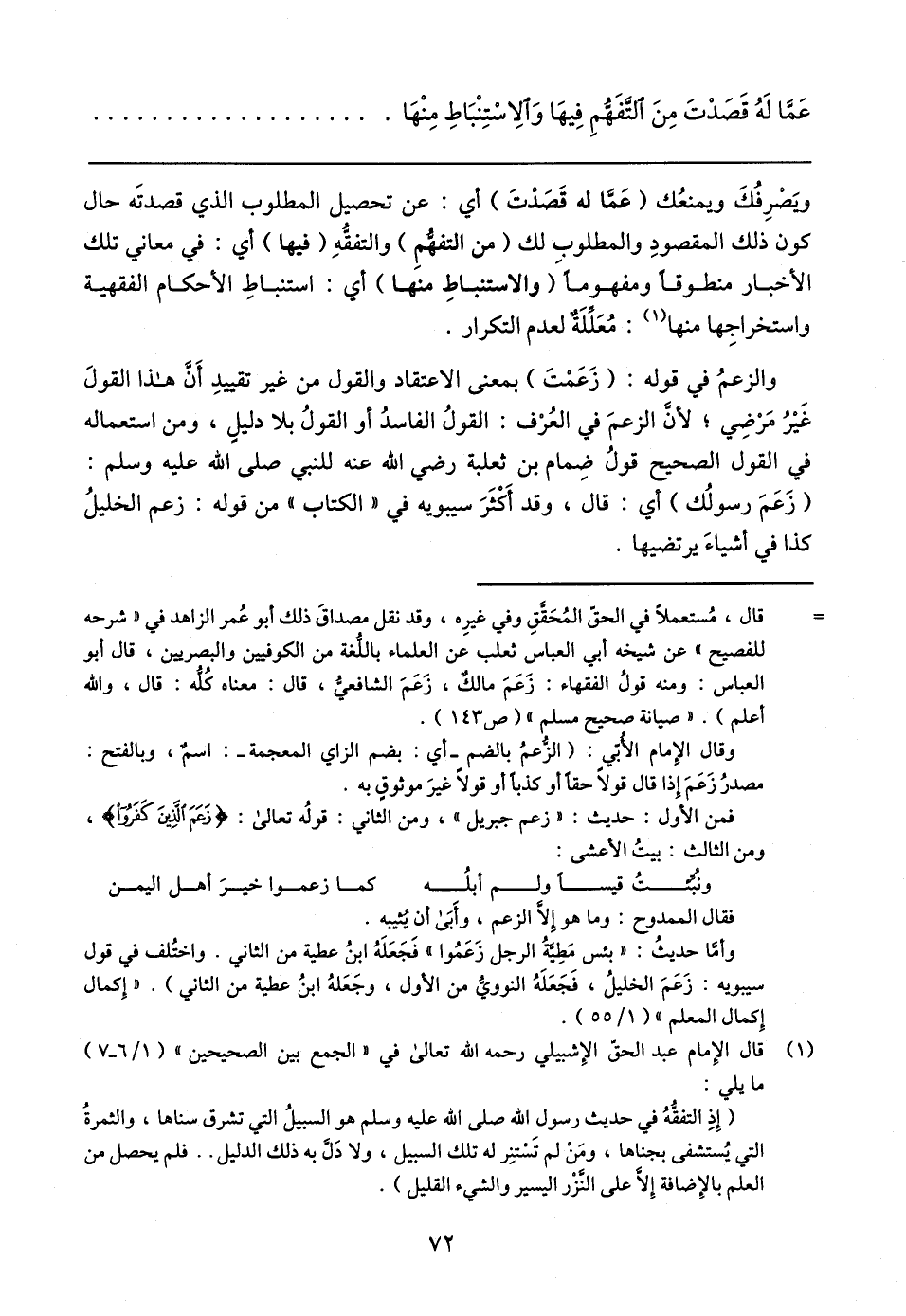وأمَّا حديثُ: "بئس مَطِيَّةُ الرجل زَعَمُوا" فَجَعَلَهُ ابنُ عطية من الثاني. واختُلف في قول سيبويه: زَعَمَ الخليلُ، فَجَعَلَهُ النوويُّ من الأول، وجَعَلهُ ابنُ عطية من الثاني). "إِكمال إِكمال المعلم" (١/ ٥٥).