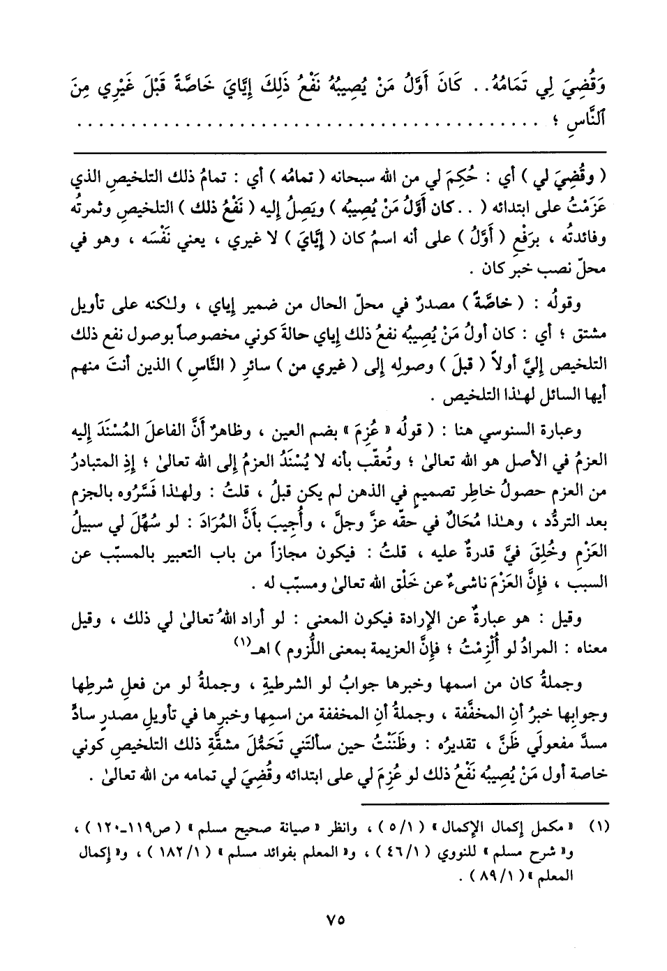 وعبارة السنوسي هنا: (قولُه "عُزِمَ" بضم العين، وظاهرٌ أَنَّ الفاعلَ المُسْنَدَ إِليه العزمُ في الأصل هو الله تعالى؛ وتُعقّب بأنه لا يُسْنَدُ العزمُ إِلى الله تعالى؛ إِذِ المتبادرُ من العزم حصولُ خاطِر تصميمٍ في الذهن لم يكن قبلُ، قلتُ: ولهذا فَشَّرُوه بالجزم بعد التردُّد، وهذا مُحَالٌ في حقّه عزَّ وجلَّ، وأُجيبَ بأَنَّ المُرَادَ: لو سُهِّلَ لي سبيلُ العَزْمِ وخُلِقَ فيَّ قدرةٌ عليه، قلتُ: فيكون مجَازًا من باب التعبير بالمسبّب عن السبب، فإنَّ العَزْمَ ناشئٌ عن خَلْق الله تعالى ومسبّب له.