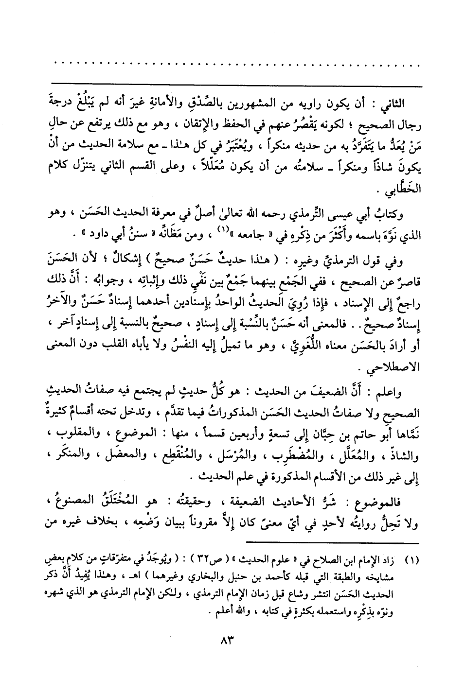 (١) زاد الإِمام ابن الصلاح في "علوم الحديث" (ص ٣٢): (ويوجَدُ في متفرّقاتٍ من كلام بعضِ مشايخه والطبقة التي قبله كأحمد بن حنبل والبخاري وغيرهما) اهـ، وهذا يُفِيدُ أَن ذكر الحديث الحَسَن انتشر وشاع قبل زمان الإِمام الترمذي، ولكن الإِمام الترمذي هو الذي شهره ونوّه بذِكْرِه واستعمله بكثرةٍ في كتابه، والله أعلم.