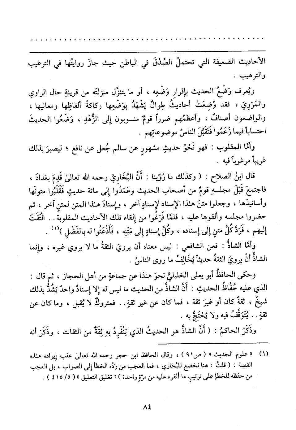 وأمَّا الشاذُّ: فعن الشافعي: ليس معناه أن يرويَ الثقةُ ما لا يروي غيره، وإِنما الشاذُّ أنْ يرويَ الثقةُ حديثًا يُخَالِفُ ما روى الناسُ.