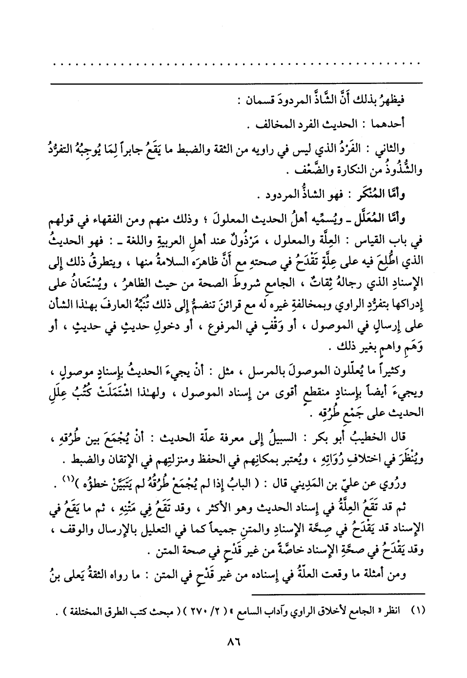 وأمَّا المُعَلَّل -ويُسمِّيه أهلُ الحديث المعلولَ؛ وذلك منهم ومن الفقهاء في قولهم في باب القياس: العِلَّة والمعلول، مَرْذُولٌ عند أهلِ العربيةِ واللغة-: فهو الحديثُ الذي اطُّلِعَ فيه على عِلَّةِ تَقْدَحُ في صحتهِ مع أَنَّ ظاهرَه السلامةُ منها، ويتطرقُ ذلك إِلى الإِسنادِ الذي رجالهُ ثِقاتٌ، الجامعِ شروطَ الصحة من حيث الظاهرُ، ويُسْتَعانُ على إِدراكها بتفرُّدِ الراوي وبمخالفةِ غيره له مع قرائنَ تنضمُّ إِلى ذلك تُنَبِّهُ العارفَ بهذا الشأن على إِرسالِ في الموصول، أو وَقْفٍ في المرفوع، أو دخولِ حديثٍ في حديثٍ، أو وَهَمِ واهمٍ بغير ذلك.