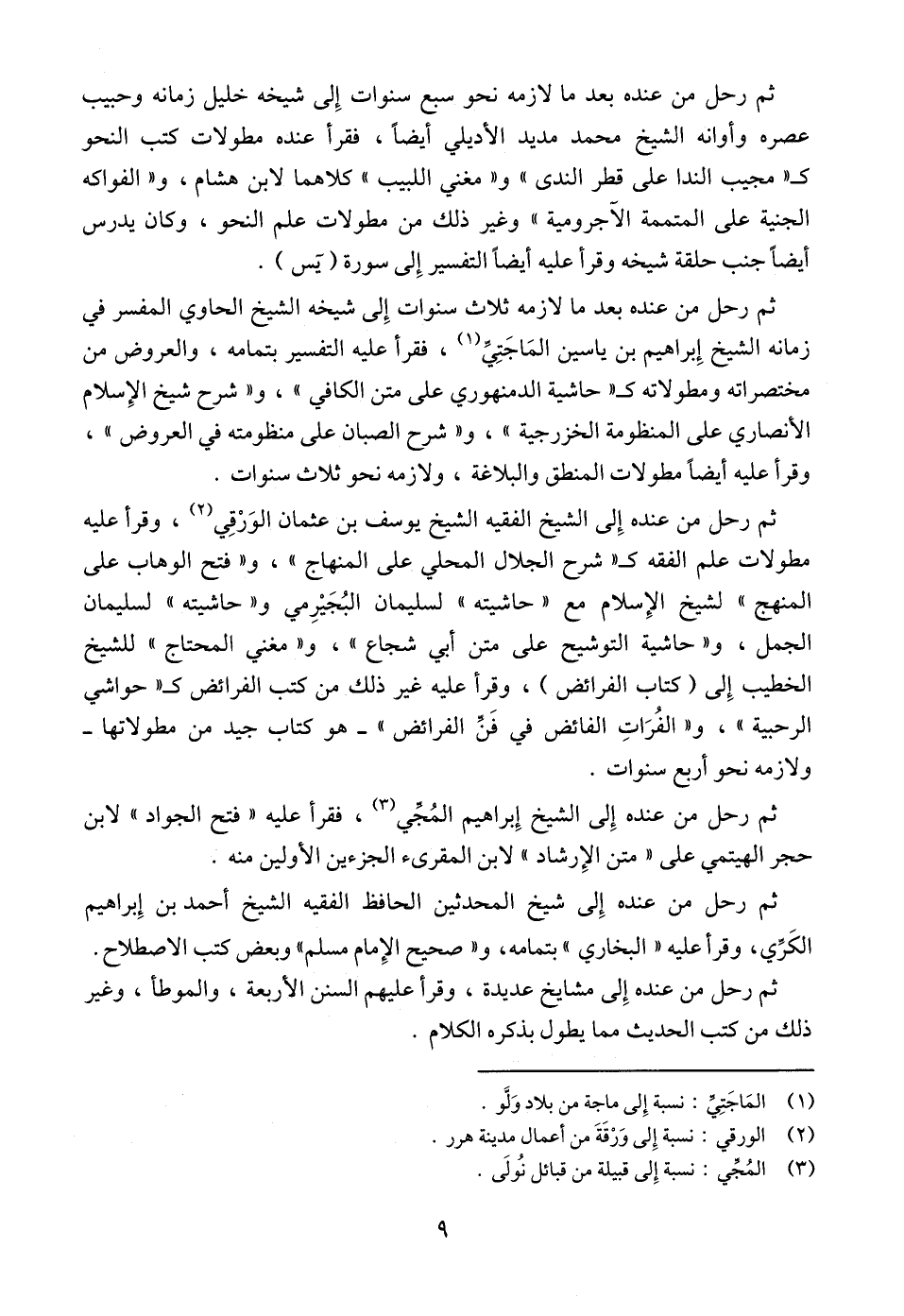 ثم رحل من عنده بعد ما لازمه ثلاث سنوات إِلى شيخه الشيخ الحاوي المفسر في زمانه الشيخ إِبراهيم بن ياسين المَاجَتِيِّ (١)، فقرأ عليه التفسير بتمامه، والعروض من مختصراته ومطولاته كـ "حاشية الدمنهوري على متن الكافي"، و"شرح شيخ الإِسلام الأنصاري على المنظومة الخزرجية"، و"شرح الصبان على منظومته في العروض"، وقرأ عليه أيضًا مطولات المنطق والبلاغة، ولازمه نحو ثلاث سنوات.