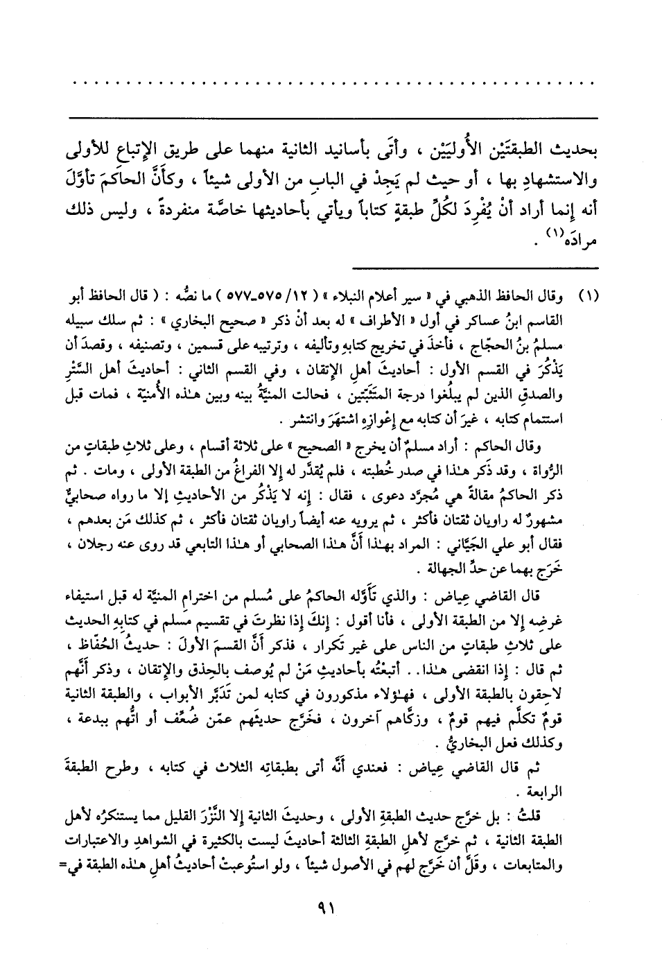 قال القاضي عِياض: والذي تَأَوَّله الحاكمُ على مُسلم من اخترام المنيَّة له قبل استيفاء غرضِه إِلا من الطبقة الأولى، فأنا أقول: إِنكَ إِذا نظرتَ في تقسيم مَسلم في كتابهِ الحديث على ثلاثِ طبقاتٍ من الناس على غير تَكرار، فذكر أَن القسمَ الأولَ: حديثُ الحُفّاظ، ثم قال إِذا انقضى هذا. . أتبعْتُه بأحاديثِ مَن لم يُوصف بالحِذق والإِتقان، وذكر أَنَّهم لاحِقون بالطبقة الأولى، فهؤلاء مذكورون في كتابه لمن تَدَبَّر الأبواب، والطبقة الثانية قومٌ تكلَّم فيهم قومٌ، وزكَّاهم آخرون، فخَرَّج حديثَهم عمّن ضُعِّف أو اتُّهم ببدعة، وكذلك فعل البخاريُّ.
