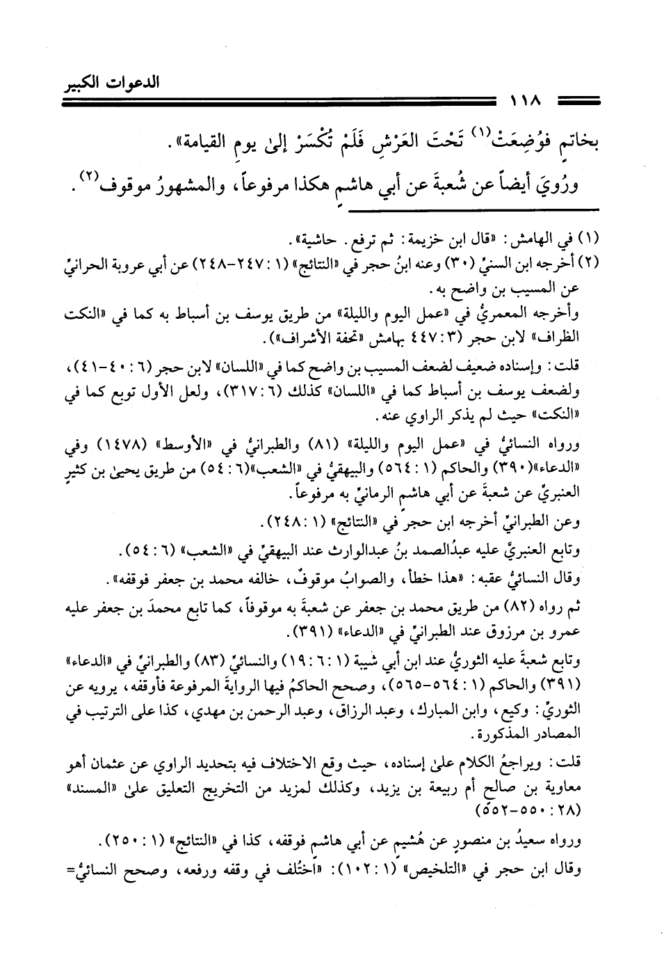 59 - أَخْبَرَنَا أَبُو حَازِمٍ عَمْرُو بْنُ أَحْمَدَ الْعَبْدَوِيُّ الْحَافِظُ، أَخْبَرَنَا إِبْرَاهِيمُ بْنُ أَحْمَدَ بْنِ رَجَاءٍ، أَخْبَرَنَا الْحَسَنُ بْنُ سُفْيَانَ الشَّيْبَانِيُّ، حَدَّثَنَا الْمُسَيَّبُ بْنُ وَاضِحٍ، حَدَّثَنَا يُوسُفُ بْنُ أَسْبَاطِ، عَنْ سُفْيَانَ، عَنْ أَبِي هَاشِمٍ، عَنْ أَبِي مِجْلَزٍ، عَنْ قَيْسِ بْنِ عَبَّادٍ، عَنْ أَبِي سَعِيدٍ الْخُدْرِيِّ، قَالَ: قَالَ رَسُولُ اللَّهِ صَلَّى اللهُ عَلَيْهِ وَسَلَّمَ: " §مَنْ تَوَضَّأَ فَأَسْبَغَ الْوَضُوءَ، ثُمَّ قَالَ عِنْدَ فَرَاغِهِ مِنْ وَضُوئِهِ: سُبْحَانَكَ اللَّهُمَّ وَبِحَمْدِكَ، إِنِّي أَشْهَدُ أَنْ لَا إِلَهَ إِلَّا أَنْتَ، أَسْتَغْفِرُكَ وَأَتُوبُ إِلَيْكَ، خُتِمَ عَلَيْهَا بِخَاتَمٍ فَوُضِعَتْ تَحْتَ الْعَرْشِ، فَلَمْ تُكْسَرْ إِلَى يَوْمِ الْقِيَامَةِ " وَرُوِيَ أَيْضًا عَنْ شُعْبَةَ، عَنْ أَبِي هَاشِمٍ هَكَذَا مَرْفُوعًا، وَالْمَشْهُورُ مَوْقُوفٌ