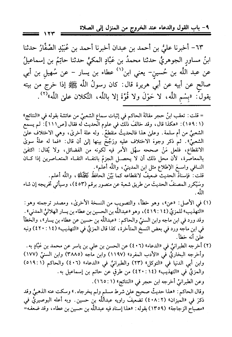 63 - أَخْبَرَنَا عَلِيُّ بْنُ أَحْمَدَ بْنِ عَبْدَانَ، أَخْبَرَنَا أَحْمَدُ بْنُ عُبَيْدٍ الصَّفَّارُ، حَدَّثَنَا ابْنُ مُسَاوِرٍ الْجَوْهَرِيُّ، حَدَّثَنَا مُحَمَّدُ بْنُ عَبَّادٍ الْمَكِّيُّ، حَدَّثَنَا حَاتِمُ بْنُ إِسْمَاعِيلَ، عَنْ عَبْدِ اللَّهِ بْنِ حُسَيْنٍ يَعْنِي ابْنَ عَطَاءِ بْنِ يَسَارٍ عَنْ سُهَيْلِ بْنِ أَبِي صَالِحٍ، عَنْ أَبِيهِ، عَنْ أَبِي هُرَيْرَةَ، قَالَ: كَانَ رَسُولُ اللَّهِ صَلَّى اللهُ عَلَيْهِ وَسَلَّمَ " §إِذَا خَرَجَ مِنْ بَيْتِهِ يَقُولُ: «بِاسْمِ اللَّهِ، لَا حَوْلَ وَلَا قُوَّةَ إِلَّا بِاللَّهِ، التُّكْلَانُ عَلَى اللَّهِ»