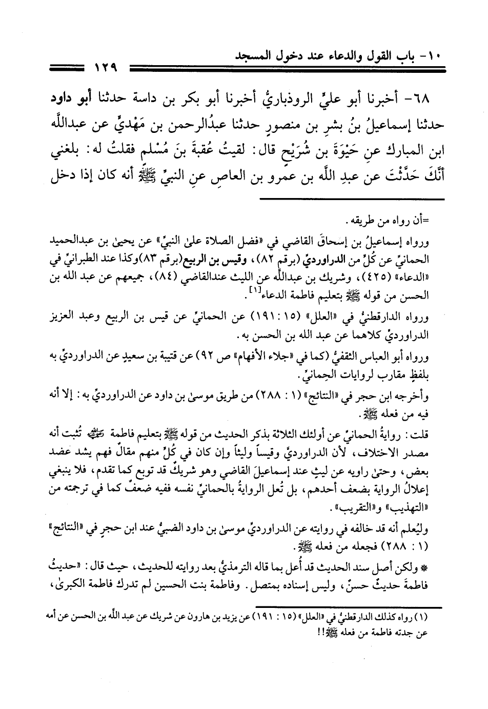 68 - أَخْبَرَنَا أَبُو عَلِيٍّ الرُّوذْبَارِيُّ، أَخْبَرَنَا أَبُو بَكْرِ بْنُ دَاسَةَ، حَدَّثَنَا أَبُو دَاوُدَ، حَدَّثَنَا إِسْمَاعِيلُ بْنُ بِشْرِ بْنِ مَنْصُورٍ، حَدَّثَنَا عَبْدُ الرَّحْمَنِ بْنُ مَهْدِيٍّ، عَنْ عَبْدِ اللَّهِ بْنِ الْمُبَارَكِ، عَنْ حَيْوَةَ بْنِ شُرَيْحٍ، قَالَ: لَقِيتُ عُقْبَةَ بْنَ مُسْلِمٍ فَقُلْتُ لَهُ: بَلَغَنِي أَنَّكَ حَدَّثْتَ عَنْ عَبْدِ اللَّهِ بْنِ عَمْرِو بْنِ الْعَاصِ، عَنِ النَّبِيِّ صَلَّى اللهُ عَلَيْهِ وَسَلَّمَ أَنَّهُ كَانَ إِذَا دَخَلَ الْمَسْجِدَ قَالَ: «§أَعُوذُ بِاللَّهِ الْعَظِيمِ، وَبِوَجْهِهِ الْكَرِيمِ، وَسُلْطَانِهِ الْقَدِيمِ، مِنَ الشَّيْطَانِ الرَّجِيمِ» قَالَ: أَقَطْ؟ قُلْتُ: نَعَمْ، قَالَ: فَإِذَا قَالَ ذَلِكَ قَالَ الشَّيْطَانُ: حُفِظَ مِنِّي سَائِرَ الْيَوْمِ "
