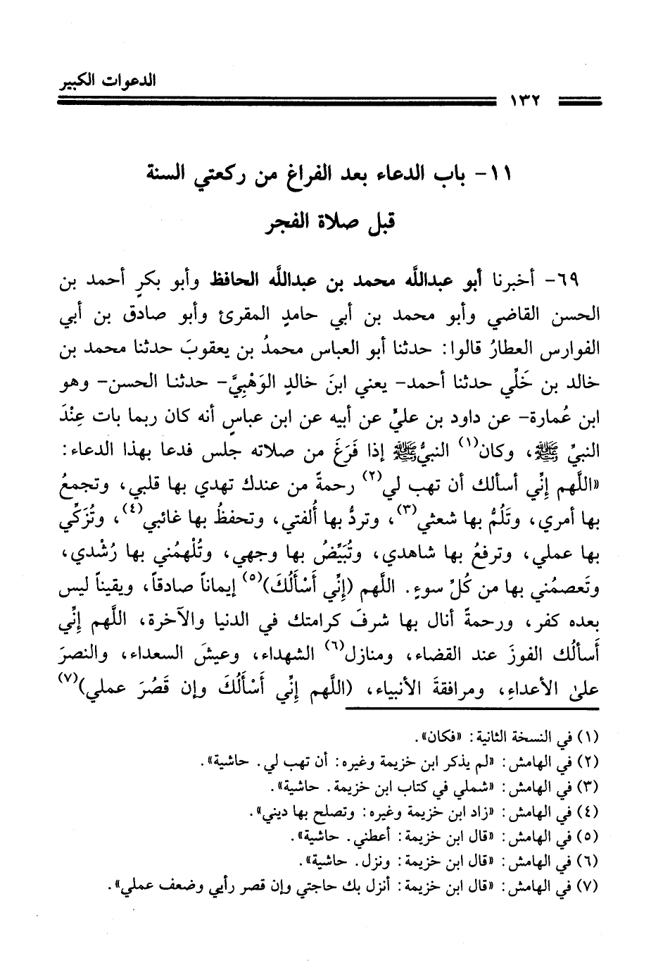 69 - أَخْبَرَنَا أَبُو عَبْدِ اللَّهِ مُحَمَّدُ بْنُ عَبْدِ اللَّهِ الْحَافِظُ وَأَبُو بَكْرٍ أَحْمَدُ بْنُ الْحَسَنِ الْقَاضِي، وَأَبُو مُحَمَّدِ بْنُ أَبِي حَامِدٍ الْمُقْرِئُ، وَأَبُو صَادِقِ بْنُ أَبِي الْفَوَارِسِ الْعَطَّارُ قَالُوا: حَدَّثَنَا أَبُو الْعَبَّاسِ مُحَمَّدُ بْنُ يَعْقُوبَ، حَدَّثَنَا مُحَمَّدُ بْنُ خَالِدِ بْنِ خَلِيٍّ، حَدَّثَنَا أَحْمَدُ يَعْنِي ابْنَ خَالِدٍ الْوَهْبِيِّ، حَدَّثَنَا الْحَسَنُ وَهُوَ ابْنُ عُمَارَةَ عَنْ دَاوُدَ بْنِ عَلِيٍّ، عَنْ أَبِيهِ، عَنِ ابْنِ عَبَّاسٍ، أَنَّهُ كَانَ رُبَّمَا بَاتَ عِنْدَ النَّبِيِّ صَلَّى اللهُ عَلَيْهِ وَسَلَّمَ، فَكَانَ النَّبِيُّ صَلَّى اللهُ عَلَيْهِ وَسَلَّمَ إِذَا فَرَغَ مِنْ صَلَاتِهِ جَلَسَ فَدَعَا بِهَذَا الدُّعَاءِ: §«اللَّهُمَّ إِنِّي أَسْأَلُكَ أَنْ تَهَبَ لِي رَحْمَةً مِنْ عِنْدِكَ تَهْدِي بِهَا قَلْبِي، وَتَجْمَعُ بِهَا أَمْرِي، وَتَلُمُّ بِهَا شَعَثِي، وَتُرَدُّ بِهَا أُلْفَتِي، وَتَحْفَظُ بِهَا غَائِبِي، وَتُزَكِّي بِهَا عَمَلِي، وَتَرْفَعُ بِهَا شَاهِدِي، وِتُبَيِّضُ بِهَا وَجْهِي، وَتُلْهِمُنِي بِهَا رُشْدِي، وَتَعْصِمُنِي بِهَا مِنْ كُلِّ سُوءٍ، اللَّهُمَّ إِنِّي أَسْأَلُكَ إِيمَانًا صَادِقًا، وَيَقِينًا لَيْسَ بَعْدَهُ كُفْرٌ، وَرَحْمَةً أَنَالُ بِهَا شَرَفَ كَرَامَتِي فِي الدُّنْيَا وَالْآخِرَةِ، اللَّهُمَّ إِنِّي أَسْأَلُكَ الْفَوْزَ عِنْدَ الْقَضَاءِ، وَمَنَازِلَ الشُّهَدَاءِ، وَعَيْشَ السُّعَدَاءِ، وَالنَّصْرَ عَلَى الْأَعْدَاءِ، وَمُرَافَقَةَ الْأَنْبِيَاءِ، اللَّهُمَّ إِنِّي أَسْأَلُكَ، وَإِنْ قَصَرَ عَمَلِي، وَضَعُفَ رَأْيِي، وَافْتَقَرْتُ إِلَى رَحْمَتِكَ، فَإِنِّي أَسْأَلُكَ يَا قَاضِيَ الْأُمُورِ، وَيَا شَافِيَ الصُّدُورِ، كَمَا تُجِيرُ بَيْنَ الْبُحُورِ، أَنْ تُجِيرَنِي مِنْ عَذَابِ السَّعِيرِ، وَمِنْ دَعْوَةِ الثُّبُورِ، وَمِنْ فِتْنَةِ الْقُبُورِ -[133]-، اللَّهُمَّ وَمَا قَصُرَ عَنْهُ عَمَلِي، وَلَمْ تَبْلُغْهُ مَسْأَلَتِي مِنْ خَيْرٍ وَعَدْتَهُ أَحَدًا مِنْ عِبَادِكَ، أَوْ خَيْرٍ أَنْتَ مُعْطِيهِ أَحَدًا مِنْ خَلْقِكَ، فَإِنِّي أَسْأَلُكَ إِيَّاهُ، وَأَرْغَبُ إِلَيْكَ فِيهِ، بِرَحْمَتِكَ يَا رَبَّ الْعَالَمِينَ، اللَّهُمَّ اجْعَلْنَا هُدَاةً مُهْتَدِينَ، غَيْرَ ضَالِّينَ، وَلَا مُضِلِّينَ، حَرْبًا لِأَعْدَائِكَ، وَسِلْمًا لِأَوْلِيَائِكَ، نُحِبُّ بِحُبِّكَ النَّاسَ، وَنُعَادِي بِعَدَاوَتِكَ مَنْ خَالَفَكَ، اللَّهُمَّ ذَا الْأَمْرِ الرَّشِيدِ، وَالْحِمْلِ الشَّدِيدِ، أَسْأَلُكَ الْأَمْنَ يَوْمَ الْوَعِيدِ، وَالْجَنَّةِ يَوْمَ الْخُلُودِ، مَعَ الْمُقَرَّبِينَ الشُّهُودِ، وَالرُّكَّعِ السُّجُودِ، الْمُوفِينَ بِالْعُهُودِ، إِنَّكَ رَحِيمٌ وَدُودٌ، وَأَنْتَ تَفْعَلُ مَا تُرِيدُ، اللَّهُمَّ رَبِّي وَإِلَهِي، هَذَا الدُّعَاءُ وَعَلَيْكَ الْإِجَابَةُ، وَهَذَا الْجَهْدُ وَعَلَيْكَ التُّكْلَانُ، وَلَا حَوْلَ وَلَا قُوَّةَ إِلَّا بِاللَّهِ، اللَّهُمَّ اجْعَلْ لِي نُورًا فِي قَلْبِي، وَنُورًا فِي قَبْرِي، وَنُورًا فِي سَمْعِي، وَنُورًا فِي بَصَرِي، وَنُورًا فِي لَحْمِي، وَنُورًا فِي دَمِي، وَنُورًا فِي مُخِّي، وَنُورًا فِي عِظَامِي، وَنُورًا فِي شَعْرِي، وَنُورًا فِي بَشَرِي، وَنُورًا مِنْ بَيْنِ يَدَيَّ، وَنُورًا مِنْ خَلْفِي، وَنُورًا مِنْ فَوْقِي، وَنُورًا مِنْ تَحْتِي، اللَّهُمَّ زِدْنِي نُورًا، وَأَعْطِنِي نُورًا، سُبْحَانَ الَّذِي لَبِسَ الْعِزَّ وَلَاقَ بِهِ، سُبْحَانَ الَّذِي لَا يَنْبَغِي التَّسْبِيحُ إِلَّا لَهُ، سُبْحَانَ الَّذِي أَحْصَى كُلَّ شَيْءٍ بِعِلْمِهِ، سُبْحَانَ ذِي الْمَنِّ وَالنِّعَمِ، سُبْحَانَ ذِي الطَّوْلِ وَالْفَضْلِ، 