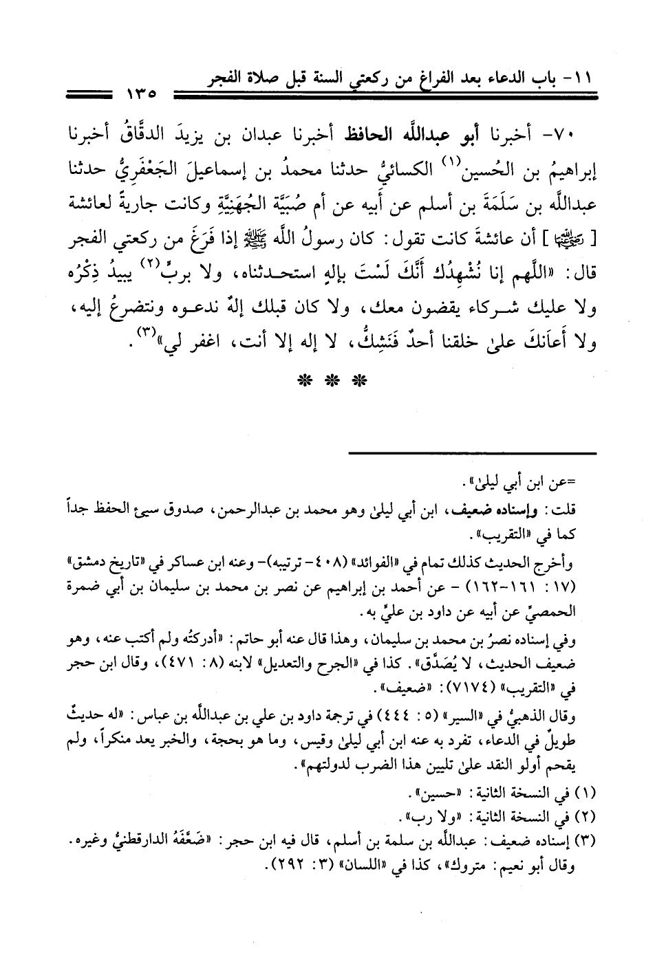 70 - أَخْبَرَنَا أَبُو عَبْدِ اللَّهِ الْحَافِظُ، أَخْبَرَنَا عَبْدَانُ بْنُ بُرَيْدٍ الدَّقَّاقُ، أَخْبَرَنَا إِبْرَاهِيمُ بْنُ حُسَيْنٍ الْكِسَائِيُّ، حَدَّثَنَا مُحَمَّدُ بْنُ إِسْمَاعِيلَ الْجَعْفَرِيُّ، حَدَّثَنَا عَبْدُ اللَّهِ بْنُ سَلَمَةَ بْنِ أَسْلَمَ، عَنْ أَبِيهِ، عَنْ أُمِّ صُبَيَّةَ الْجُهَنِيَّةِ، وَكَانَتْ، جَارِيَةً لِعَائِشَةَ رَضِيَ اللَّهُ عَنْهَا، أَنَّ عَائِشَةَ كَانَتْ تَقُولُ: كَانَ رَسُولُ اللَّهِ صَلَّى اللهُ عَلَيْهِ وَسَلَّمَ " §إِذَا فَرَغَ مِنْ رَكْعَتَيِ الْفَجْرِ قَالَ: «اللَّهُمَّ إِنَّا نُشْهِدُكَ أَنَّكَ لَسْتَ بِإِلَهٍ اسْتَحْدَثْنَاهُ، وَلَا رَبٍّ يَبِيدُ ذِكْرُهُ، وَلَا عَلَيْكَ شُرَكَاءٌ يَقْضُونَ مَعَكَ، وَلَا كَانَ قَبْلَكَ إِلَهٌ نَدْعُوهُ وَنَتَضَرَّعُ إِلَيْهِ، وَلَا أَعَانَكَ عَلَى خَلْقِنَا أَحَدٌ فَنَشَكَّ، لَا إِلَهَ إِلَّا أَنْتَ، اغْفِرْ لِي»
