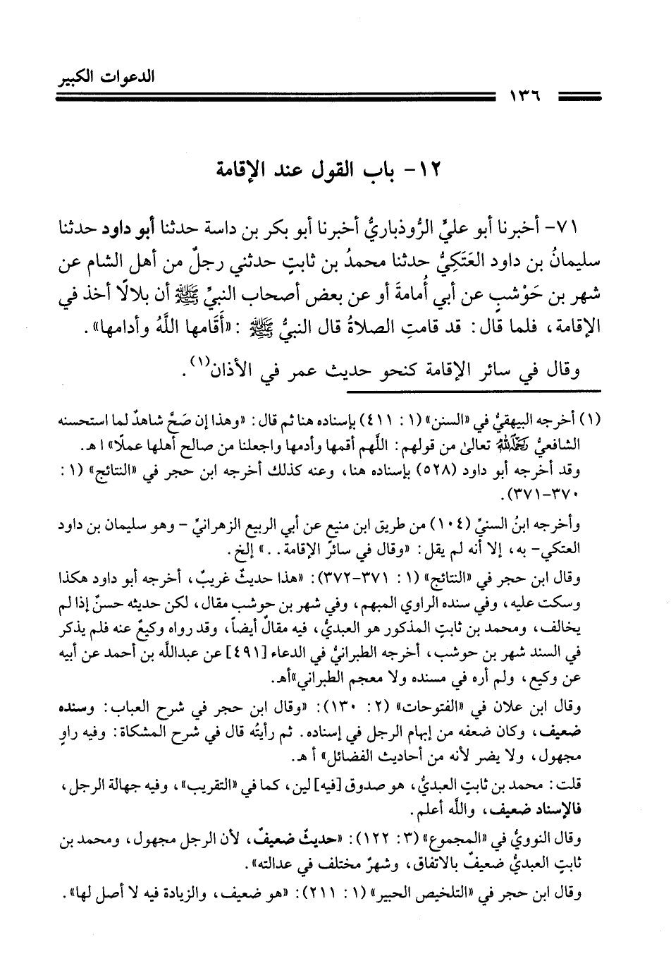 71 - أَخْبَرَنَا أَبُو عَلِيٍّ الرُّوذْبَارِيُّ، أَخْبَرَنَا أَبُو بَكْرِ بْنُ دَاسَةَ، حَدَّثَنَا أَبُو دَاوُدَ، حَدَّثَنَا سُلَيْمَانُ بْنُ دَاوُدَ الْعَتَكِيُّ، حَدَّثَنَا مُحَمَّدُ بْنُ ثَابِتٍ، حَدَّثَنِي رَجُلٌ، مِنْ أَهْلِ الشَّامِ، عَنْ شَهْرِ بْنِ حَوْشَبٍ، عَنْ أَبِي أُمَامَةَ، أَوْ عَنْ بَعْضِ أَصْحَابِ النَّبِيِّ صَلَّى اللهُ عَلَيْهِ وَسَلَّمَ، أَنَّ بِلَالًا أَخَذَ فِي الْإِقَامَةِ، فَلَمَّا قَالَ: قَدْ قَامَتِ الصَّلَاةُ، قَالَ النَّبِيُّ صَلَّى اللهُ عَلَيْهِ وَسَلَّمَ: §«أَقَامَهَا اللَّهُ وَأَدَامَهَا» وَقَالَ فِي سَائِرِ الْإِقَامَةِ كَنَحْوِ حَدِيثِ عُمَرَ فِي الْأَذَانِ