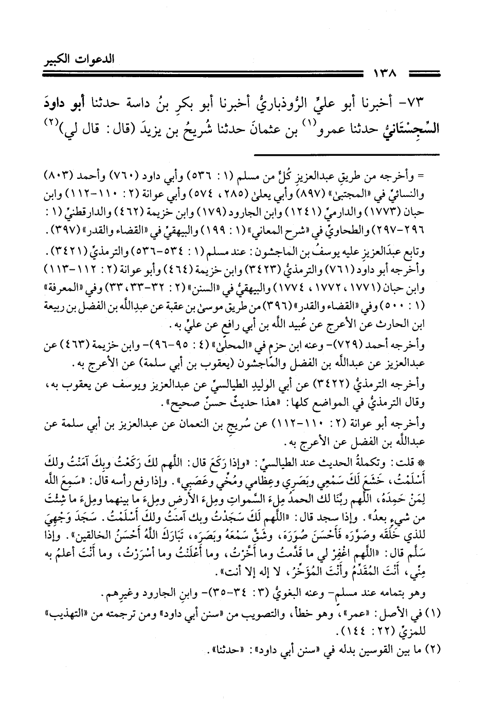 73 - أَخْبَرنَا أبو علي الزذباري أَخْبَرنَا أبو بَكْر بن داسة حَدَّثَنا أبو داود السجستاني حَدَّثَنا عمرو بن عثمان حَدَّثَنا شريح بن يزيد (قال: قال لي) شعيب بن أبي حمزة: قال لي ابن المنكدر وابن أبي فروة وغيرهما من فقهاء المدينة , فإذا قلت أنت ذاك فقل: وأنا من المسلمين , يعني قوله: وأنا أول المسلمين , وكذلك قال الشافعي.