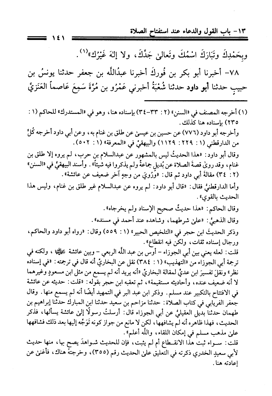 78 - أَخْبَرنَا أبو بَكْر بن فورك أَخْبَرنَا عبد الله بن جعفر حَدَّثَنا يونس بن حبيب حَدَّثَنا أبو داود حدثنا شُعْبة أَخْبَرَنِي عمرو بن مرة سمع عاصما العنزي يُحَدِّثُ عَنِ ابْنِ جُبَيْرِ بْنِ مُطْعِمٍ، عَنْ أَبِيهِ أَنَّ النَّبِيَّ صَلَّى اللهُ عَلَيْهِ وَسَلَّمَ لَمَّا دَخَلَ فِي الصَّلاَةِ كَبَّرَ قَالَ: اللَّهُ أَكْبَرُ كَبِيرًا قَالَهَا ثَلاَثًا وَالْحَمْدُ لِلَّهِ كَثِيرًا قَالَهَا ثَلاَثًا وَسُبْحَانَ اللهِ بُكْرَةً وَأَصِيلاً قَالَهَا ثَلاَثًا أَعُوذُ بِاللَّهِ مِنَ الشَّيْطَانِ الرَّجِيمِ مِنْ نَفْخِهِ وَنَفْثِهِ وَهَمْزِهِ.