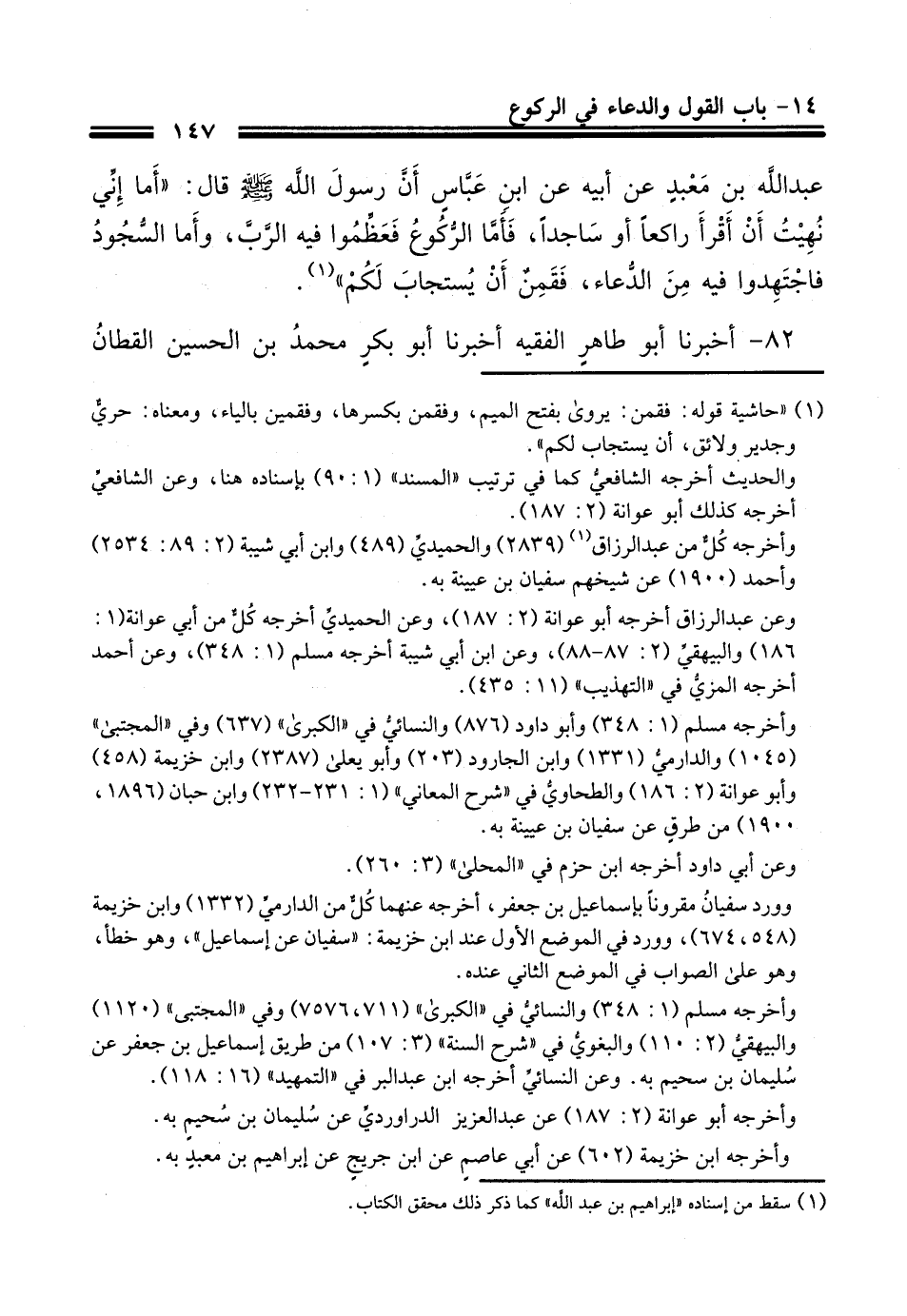 82 - أَخْبَرنَا أبو طاهر الفقيه أَخْبَرنَا أبو بكر محمد بن الحُسَين القطان حَدَّثَنا محمد بن يزيد حَدَّثَنا بدل بن المحبر حدثنا شُعْبة وعمرو بن مرة عن سعد بن عبيدة عن المستورد عن صلة بن زفر عن حذيفة رضي الله عنه , قال كان رسول الله صَلَّى اللهُ عَلَيْهِ وَسَلَّمَ يقول في ركوعه سبحان ربي العظيم ثلاثا وفي سجوده سبحان ربي الأعلى ثلاثا وكان إذا مر بآية رحمة وقف فسأل , وإذا مر بآية عذاب تعوذ.