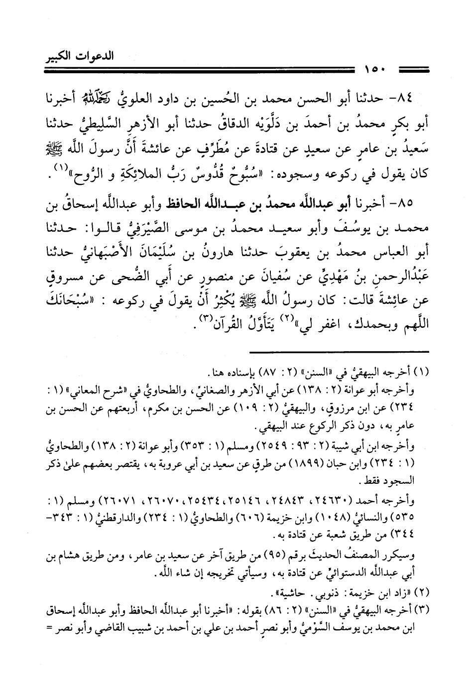 84 - أَخْبَرنَا أبو الحَسَن بن محمد بن الحُسَين بن داود العلوي رحمه الله أَخْبَرنَا أبو بكر محمد بن أحمد بن دلوية الدقاق حَدَّثَنا أبو الأزهر السليطي حَدَّثَنا سعيد بن عامر عن سعيد عن قتادة عن مطرف عن عائشة رضي الله عنها أن رسول الله صَلَّى اللهُ عَلَيْهِ وَسَلَّمَ كان يقول في ركوعه وسجوده سبوح قدوس رب الملائكة والروح.