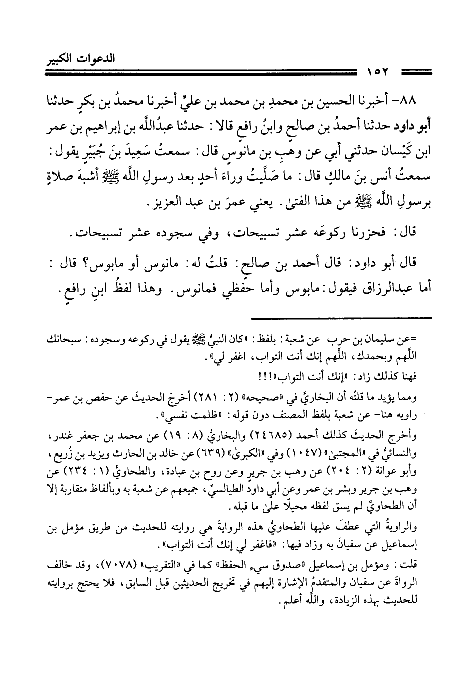 88 - أَخْبَرنَا الحُسَين بن محمد بن محمد بن علي أَخْبَرنَا محمد بن بكر حَدَّثَنا أبو داود حَدَّثَنا أحمد بن صالح وابن رافع قالا حَدَّثَنا عبد الله بن إبراهيم عمر ابن كيسان حَدَّثَنِي أبي عن وهب بن مانوس قال: سمعت سَعِيد بن جُبَيْر يقول سمعت أنس بن مالك رضي الله عنه قال ما صليت وراء أحد بعد رسول الله صَلَّى اللهُ عَلَيْهِ وَسَلَّمَ أشبه صلاة برسول الله صَلَّى اللهُ عَلَيْهِ وَسَلَّمَ من هذا الفتى يعني عمر بن عبد العزيز.