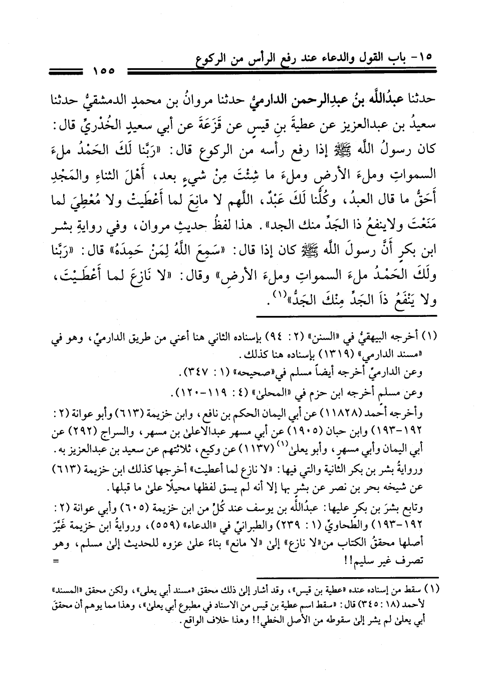 ح وَأَخْبَرنا أبو عبد الله أَخْبَرَنِي أبو الوليد الفقيه حَدَّثَنا عبد الله بن عبد الرحمن الدارمي حَدَّثَنا مروان بن محمد الدمشقي حَدَّثَنا سعيد بن عبد العزيز عن عطية بن قيس عَنْ قَزَعَةَ، عَنْ أَبِي سَعِيدٍ الْخُدْرِيِّ رَضِيَ اللَّهُ عَنْهُ كان رسول الله صَلَّى اللهُ عَلَيْهِ وَسَلَّمَ إذا رفع رأسه من الركوع قَالَ: رَبَّنَا لَكَ الْحَمْدُ مِلْءَ السَّمَاوَاتِ وَمِلْءَ الأَرْضِ، وَمِلْءَ مَا شِئْتَ مِنْ شَيْءٍ بَعْدُ، أَهْلَ الثَّنَاءِ وَالْمَجْدِ، أَحَقُّ مَا قَالَ الْعَبْدُ وَكُلُّنَا لَكَ عَبْدٌ، اللهم لاَ مَانِعَ لِمَا أَعْطَيْتَ، ولا معطي لما منعت وَلاَ يَنْفَعُ ذَا الْجَدِّ مِنْكَ الْجَدُّ.