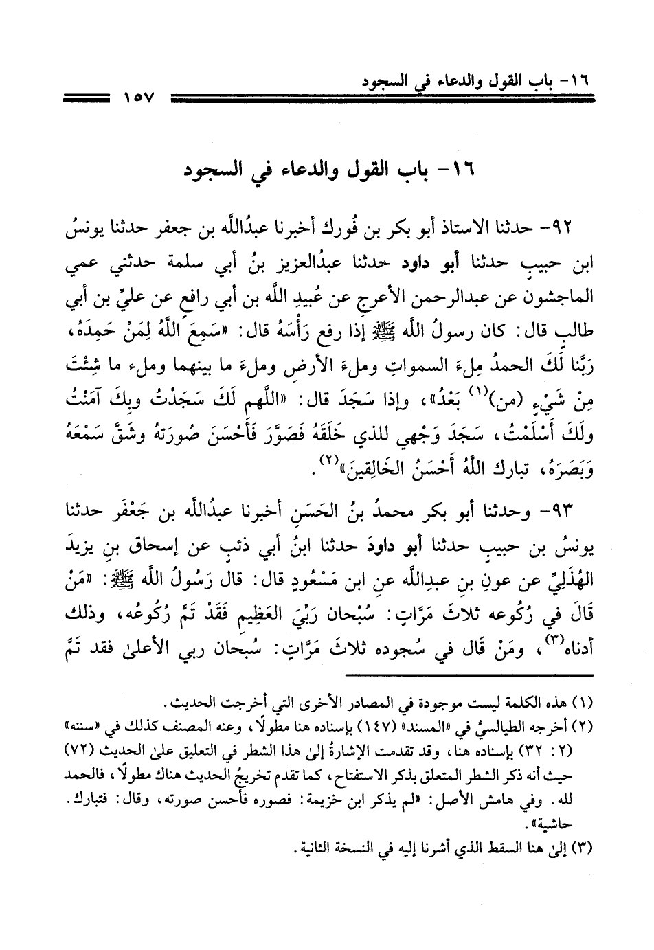 92 - حدثنا الأستاذ أبو بكر بن فورك أَخْبَرنا عبد الله بن جعفر حدثنا يونس بن حبيب حدثنا أبو داود حدثنا عبد العزيز بن أبي سلمة حدثني عمي الماجشون عن عَبْد الرَّحْمن الأعرج عن عبيد الله بن أبي رافع عن علي بن أبي طالب رضي الله عنه , قال: كان رَسُولُ اللهِ صَلَّى اللهُ عَلَيْهِ وَسَلَّمَ إذا رفع رأسه قال سمع الله لمن حمده رَبَّنَا لَكَ الْحَمْدُ مِلْءَ السَّمَاوَاتِ وَالأَرْضِ وَمَا بَيْنَهَا وَمِلْءَ مَا شِئْتَ مِنْ شَيْءٍ (من) بَعْدُ فَإِذَا سَجَدَ قَالَ: اللَّهُمَّ لَكَ سَجَدْتُ وَبِكَ آمَنْتُ، وَلَكَ أَسْلَمْتُ سَجَدَ وَجْهِي لِلَّذِي خَلْقَهُ فَصَوَّرَ فأحسن صورته وَشَقَّ سَمْعَهُ وَبَصَرَهُ، تَبَارَكَ اللَّهُ أَحْسَنُ الْخَالِقِينَ.