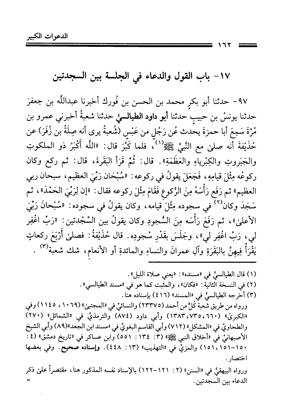 97 - حَدَّثَنَا أَبُو بَكْرٍ مُحَمَّدُ بْنُ الْحَسَنِ بْنِ فُورَكٍ، أَخْبَرَنَا عَبْدُ اللَّهِ بْنُ جَعْفَرٍ، حَدَّثَنَا يُونُسُ بْنُ حَبِيبٍ، حَدَّثَنَا أَبُو دَاوُدَ الطَّيَالِسِيُّ، حَدَّثَنَا شُعْبَةُ، أَخْبَرَنِي عَمْرُو بْنُ مُرَّةَ، سَمِعَ أَبَا حَمْزَةَ، يُحَدِّثُ، عَنْ رَجُلٍ، مِنْ عَبْسٍ، شُعْبَةُ يَرَى أَنَّهُ صِلَةُ بْنُ زُفَرٍ، عَنْ حُذَيْفَةَ أَنَّهُ صَلَّى مَعَ النَّبِيِّ صَلَّى اللهُ عَلَيْهِ وَسَلَّمَ فَلَمَّا كَبَّرَ قَالَ: «§اللَّهُ أَكْبَرُ ذُو الْمَلَكُوتِ، وَالْجَبَرُوتِ، وَالْكِبْرِيَاءِ، وَالْعَظَمَةِ» قَالَ: ثُمَّ قَرَأَ الْبَقَرَةَ قَالَ: ثُمَّ رَكَعَ فَكَانَ رُكُوعُهُ مِثْلَ قِيَامِهِ، فَجَعَلَ يَقُولُ فِي رُكُوعِهِ: «سُبْحَانَ رَبِّيَ الْعَظِيمِ، سُبْحَانَ رَبِّي الْعَظِيمِ» ثُمَّ رَفَعَ رَأْسَهُ مِنَ الرُّكُوعِ فَقَامَ مِثْلَ رُكُوعِهِ فَقَالَ: «إِنَّ لِرَبِّيَ الْحَمْدُ» ثُمَّ سَجَدَ فَكَانَ فِي سُجُودِهِ مِثْلُ قِيَامِهِ، وَكَانَ يَقُولُ فِي سُجُودِهِ: «سُبْحَانَ رَبِّيَ الْأَعْلَى» ثُمَّ رَفَعَ رَأْسَهُ مِنَ السُّجُودِ وَكَانَ يَقُولُ بَيْنَ السَّجْدَتَيْنِ: «رَبِّ اغْفِرْ لِي، رَبِّ اغْفِرْ لِي» وَجَلَسَ بِقَدْرِ سُجُودِهِ. قَالَ حُذَيْفَةُ: فَصَلَّى أَرْبَعَ رَكَعَاتٍ يَقْرَأُ فِيهِنَّ بِالْبَقَرَةِ، وَآلِ عِمْرَانَ وَالنِّسَاءِ وَالْمَائِدَةِ أَوِ الْأَنْعَامِ «شَكَّ شُعْبَةُ»