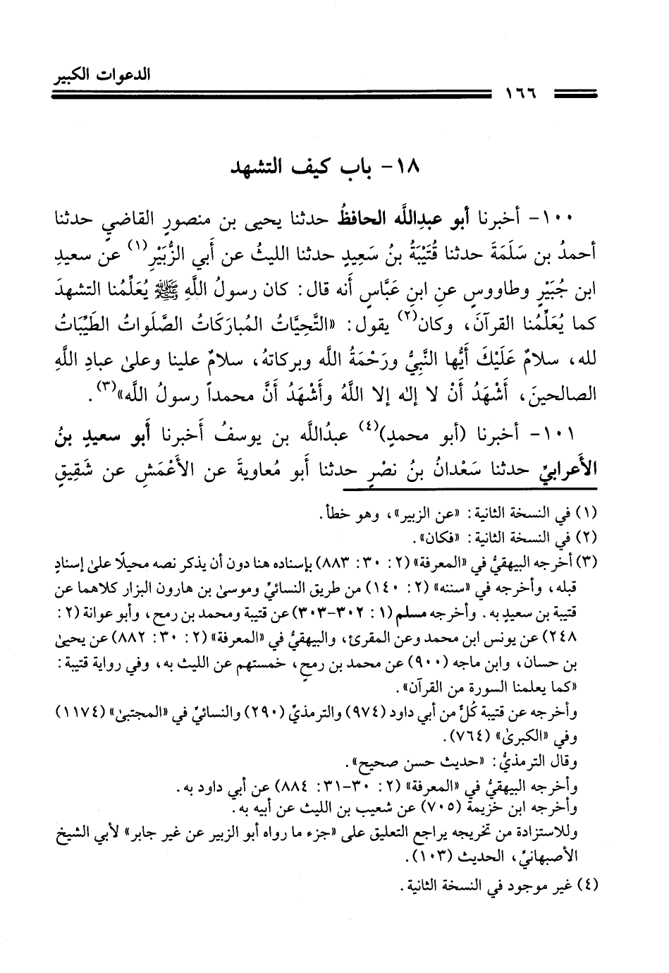 100 - أَخْبَرَنَا أَبُو عَبْدِ اللَّهِ الْحَافِظُ، حَدَّثَنَا يَحْيَى بْنُ مَنْصُورٍ الْقَاضِي، حَدَّثَنَا أَحْمَدُ بْنُ سَلَمَةَ، حَدَّثَنَا قُتَيْبَةُ بْنُ سَعِيدٍ، حَدَّثَنَا اللَّيْثُ، عَنْ أَبِي الزُّبَيْرِ، عَنْ سَعِيدِ بْنِ جُبَيْرٍ، وَطَاوُوسٍ، عَنِ ابْنِ عَبَّاسٍ، أَنَّهُ قَالَ: كَانَ رَسُولُ اللَّهِ صَلَّى اللهُ عَلَيْهِ وَسَلَّمَ " §يُعَلِّمُنَا التَّشَهُّدُ كَمَا يُعَلِّمُنَا الْقُرْآنَ، فَكَانَ يَقُولُ: «التَّحِيَّاتُ الْمُبَارَكَاتُ الصَّلَوَاتُ الطَّيِّبَاتُ لِلَّهِ، سَلَامٌ عَلَيْكَ أَيُّهَا النَّبِيُّ وَرَحْمَةُ اللَّهِ وَبَرَكَاتُهُ، سَلَامٌ عَلَيْنَا وَعَلَى عِبَادِ اللَّهِ الصَّالِحِينَ، أَشْهَدُ أَنْ لَا إِلَهَ إِلَّا اللَّهُ، وَأَشْهَدُ أَنَّ مُحَمَّدًا رَسُولُ اللَّهِ»