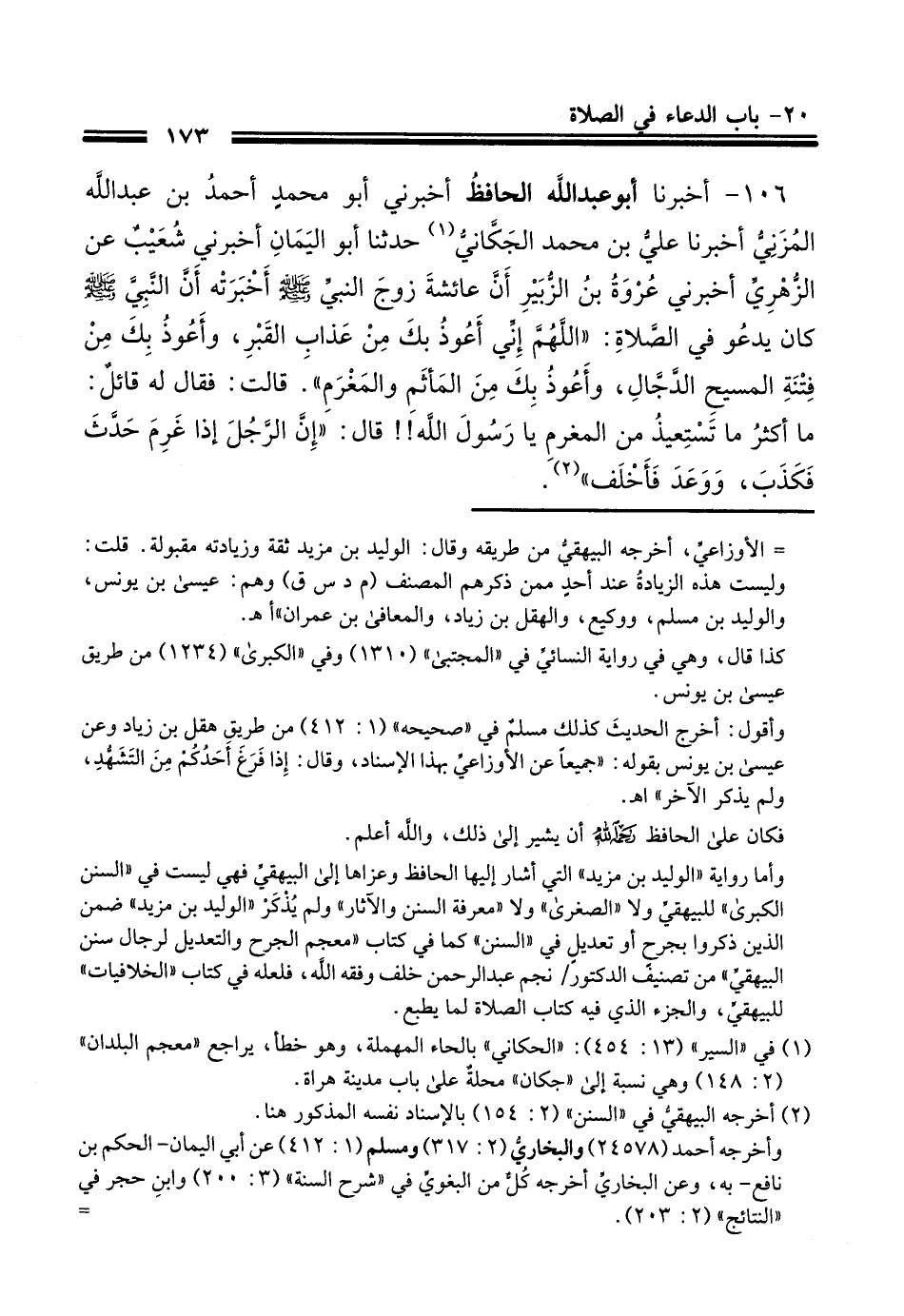 106 - أَخْبَرَنَا أَبُو عَبْدِ اللَّهِ الْحَافِظُ، أَخْبَرَنِي أَبُو مُحَمَّدٍ أَحْمَدُ بْنُ عَبْدِ اللَّهِ الْمُزَنِيُّ، أَخْبَرَنَا عَلِيُّ بْنُ مُحَمَّدِ الْجَكَانِيُّ، حَدَّثَنَا أَبُو الْيَمَانِ، أَخْبَرَنِي شُعَيْبٌ، عَنِ الزُّهْرِيِّ، أَخْبَرَنِي عُرْوَةُ بْنُ الزُّبَيْرِ، أَنَّ عَائِشَةَ، زَوْجَ النَّبِيِّ صَلَّى اللهُ عَلَيْهِ وَسَلَّمَ، أَخْبَرَتْهُ أَنَّ النَّبِيَّ صَلَّى اللهُ عَلَيْهِ وَسَلَّمَ كَانَ يَدْعُو فِي الصَّلَاةِ: «§اللَّهُمَّ إِنِّي أَعُوذُ بِكَ مِنْ عَذَابِ الْقَبْرِ، وَأَعُوذُ بِكَ مِنْ فِتْنَةِ الْمَسِيحِ الدَّجَّالِ، وَأَعُوذُ بِكَ مِنَ الْمَأْثَمِ وَالْمَغْرَمِ» قَالَتْ: فَقَالَ لَهُ قَائِلٌ: مَا أَكْثَرَ مَا تَسْتَعِيذُ مِنَ الْمَغْرَمِ يَا رَسُولَ اللَّهِ قَالَ: «إِنَّ الرَّجُلَ إِذَا غَرِمَ حَدَّثَ فَكَذَبَ، وَوَعَدَ فَأَخْلَفَ»