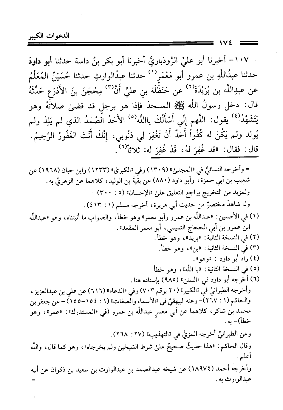107 - أَخْبَرَنَا أَبُو عَلِيٍّ الرُّوذْبَارِيُّ، أَخْبَرَنَا أَبُو بَكْرِ بْنُ دَاسَةَ، حَدَّثَنَا أَبُو دَاوُدَ، حَدَّثَنَا عَبْدُ اللَّهِ بْنُ عَمْرٍو أَبُو مَعْمَرٍ، حَدَّثَنَا عَبْدُ الْوَارِثِ، حَدَّثَنَا حُسَيْنُ الْمُعَلِّمُ، عَنْ عَبْدِ اللَّهِ بْنِ بُرَيْدٍ، عَنْ حَنْظَلَةَ بْنِ عَلِيٍّ، أَنَّ مِحْجَنَ بْنَ الْأَدْرَعِ حَدَّثَهُ قَالَ: دَخَلَ رَسُولُ اللَّهِ صَلَّى اللهُ عَلَيْهِ وَسَلَّمَ الْمَسْجِدَ، فَإِذَا هُوَ بِرَجُلٍ قَدْ قَضَى صَلَاتَهُ وَهُوَ يَتَشَهَّدُ وَهُوَ يَقُولُ: اللَّهُمَّ إِنِّي أَسْأَلُكَ بِاللَّهِ الْأَحَدِ الصَّمَدِ، الَّذِي لَمْ يَلِدْ وَلَمْ يُولَدْ، وَلَمْ يَكُنْ لَهُ كُفُوًا أَحَدٌ، أَنْ تَغْفِرَ لِي ذُنُوبِي، إِنَّكَ أَنْتَ الْغَفُورُ الرَّحِيمُ، قَالَ: فَقَالَ: «§قَدْ غُفِرَ لَهُ، قَدْ غُفِرَ لَهُ» ثَلَاثًا "