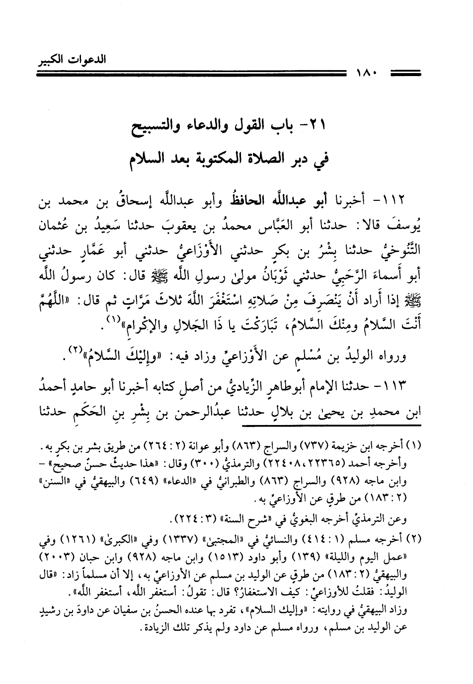 112 - أَخْبَرَنَا أَبُو عَبْدِ اللَّهِ الْحَافِظُ، وَأَبُو عَبْدِ اللَّهِ إِسْحَاقُ بْنُ مُحَمَّدِ بْنِ يُوسُفَ قَالَا: حَدَّثَنَا أَبُو الْعَبَّاسِ مُحَمَّدُ بْنُ يَعْقُوبَ، حَدَّثَنَا سَعِيدُ بْنُ عُثْمَانَ التَّنُوخِيُّ، حَدَّثَنَا بِشْرُ بْنُ بَكْرٍ، حَدَّثَنِي الْأَوْزَاعِيُّ، حَدَّثَنِي أَبُو عَمَّارٍ، حَدَّثَنِي أَبُو أَسْمَاءَ الرَّحَبِيُّ، حَدَّثَنِي ثَوْبَانُ، مَوْلَى رَسُولِ اللَّهِ صَلَّى اللهُ عَلَيْهِ وَسَلَّمَ قَالَ: كَانَ رَسُولُ اللَّهِ صَلَّى اللهُ عَلَيْهِ وَسَلَّمَ إِذَا أَرَادَ أَنْ يَنْصَرِفَ مِنْ صَلَاتِهِ " §اسْتَغْفَرَ اللَّهَ ثَلَاثَ مَرَّاتٍ، ثُمَّ قَالَ: اللَّهُمَّ أَنْتَ السَّلَامُ، وَمِنْكَ السَّلَامُ، تَبَارَكْتَ يَا ذَا الْجَلَالِ وَالْإِكْرَامِ " وَرَوَاهُ الْوَلِيدُ بْنُ مُسْلِمٍ، عَنِ الْأَوْزَاعِيِّ وَزَادَ فِيهِ: وَإِلَيْكَ السَّلَامُ